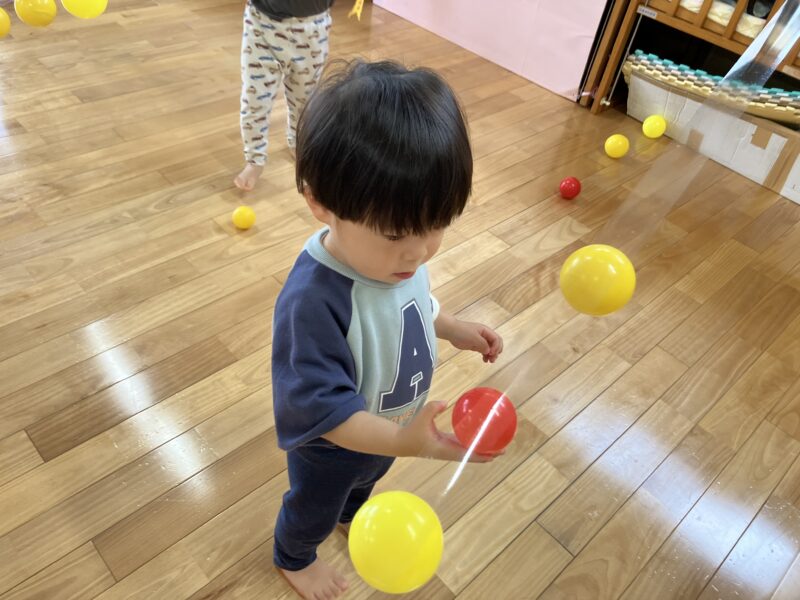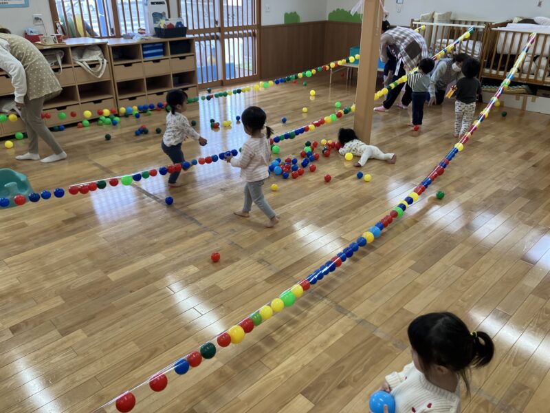 くっつけて、取って、色を見て、片づけて・・・手先や全身を使ってカラーボールに触れ、いつもと違う保育室にウキウキの子どもたちでした💛