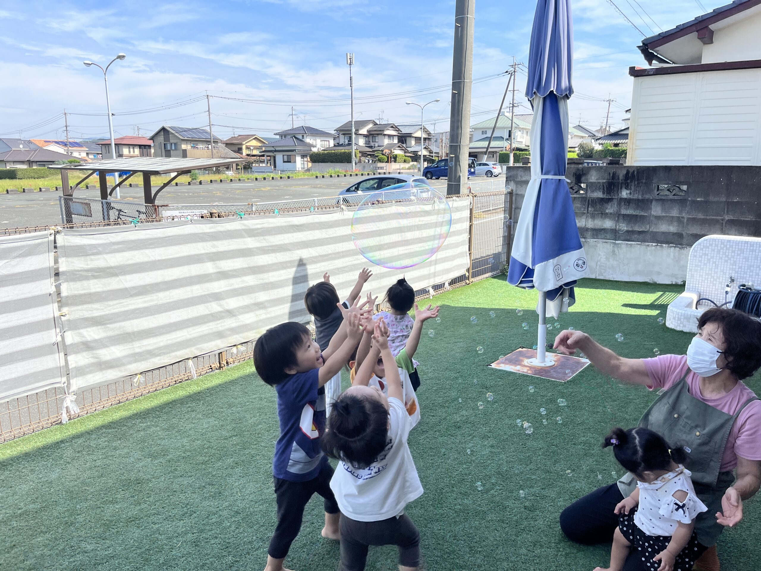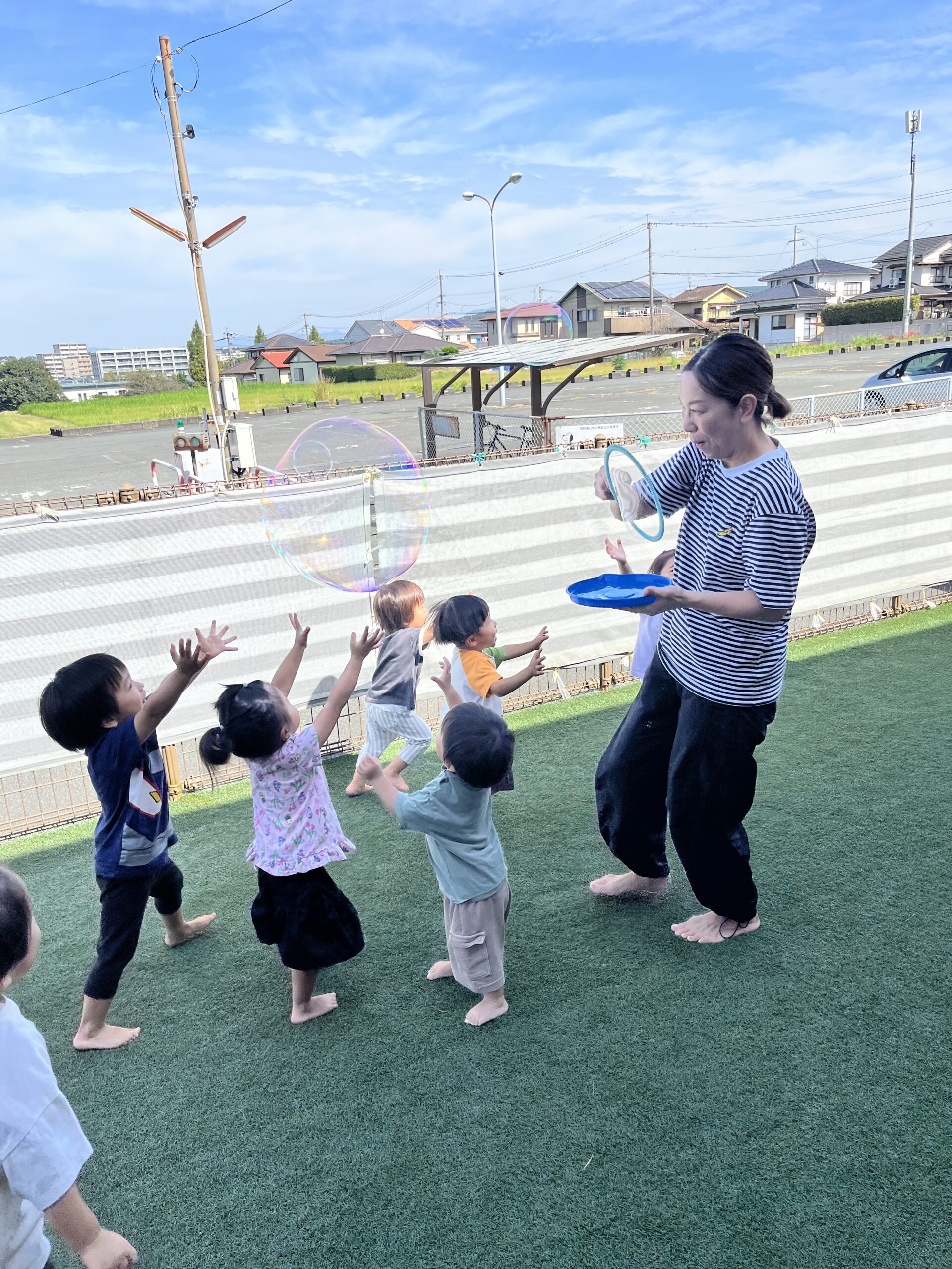 空を飛んでいくシャボン玉をみんなで追いかけます‼