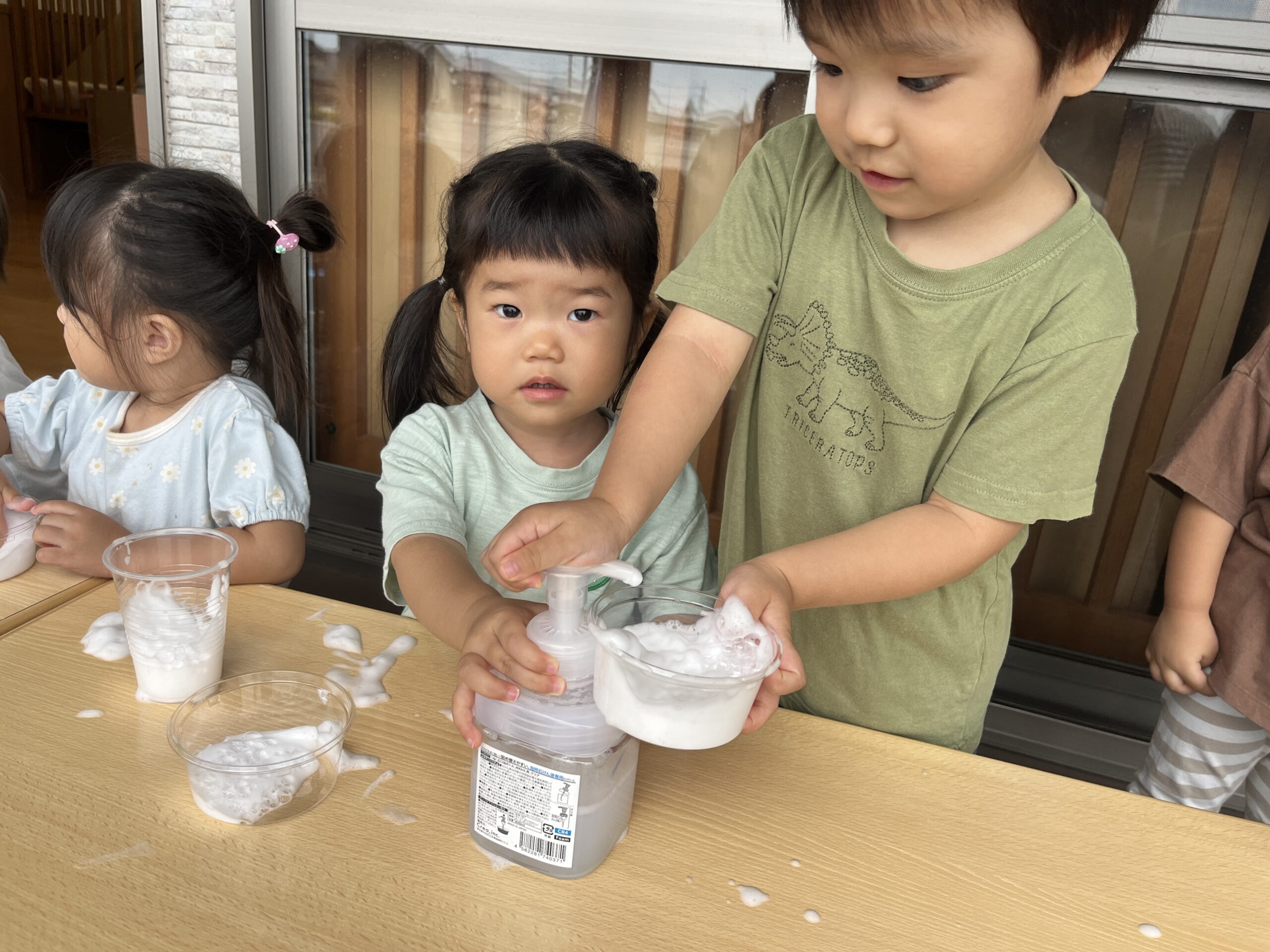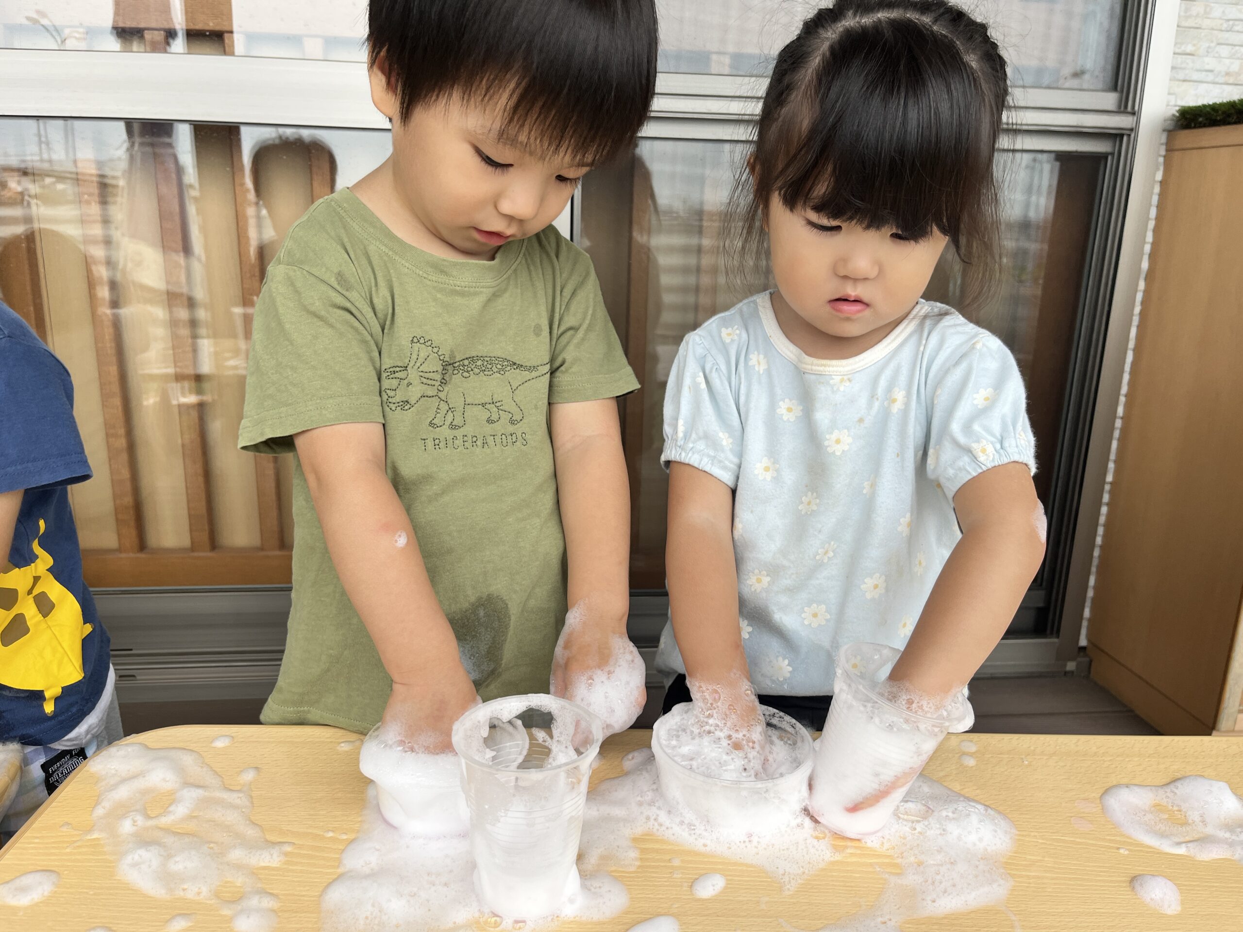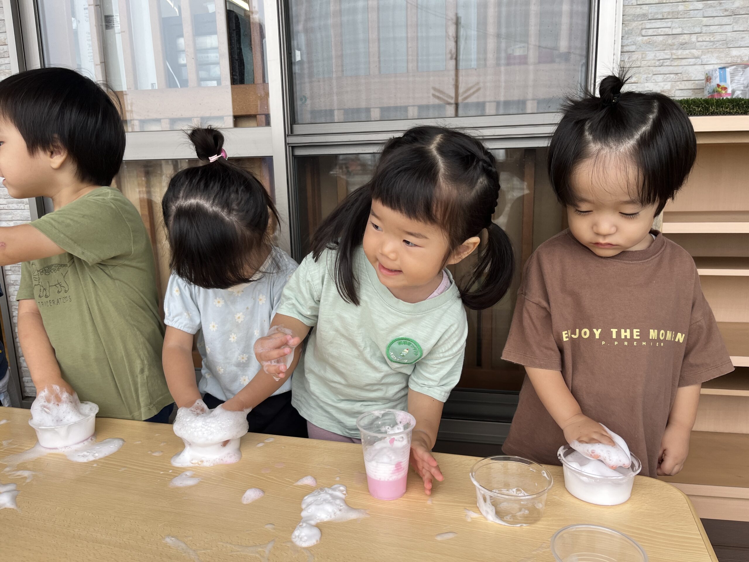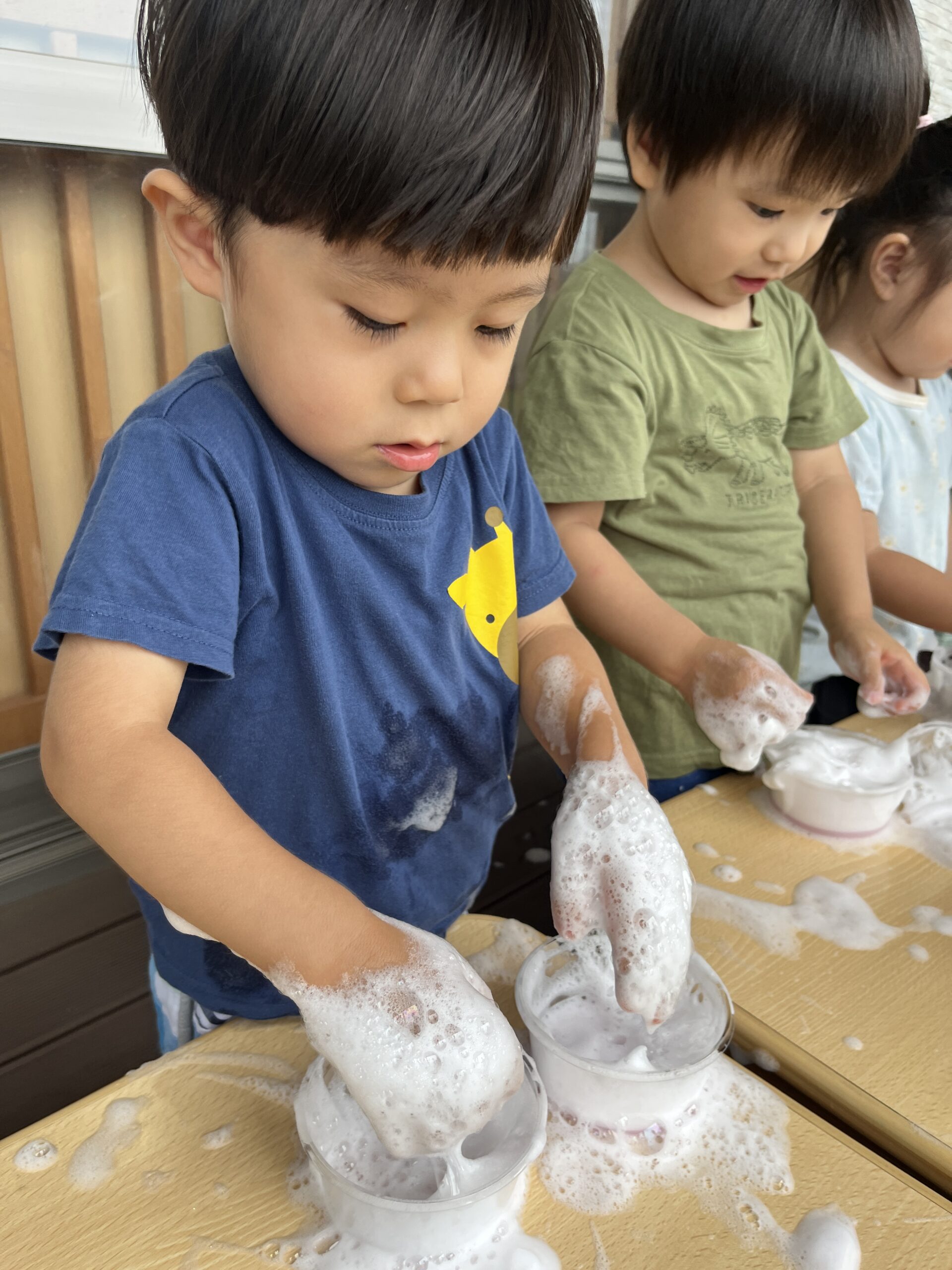 泡を使ってアイスや綿あめに見立てたりと感触遊びを楽しみました☺