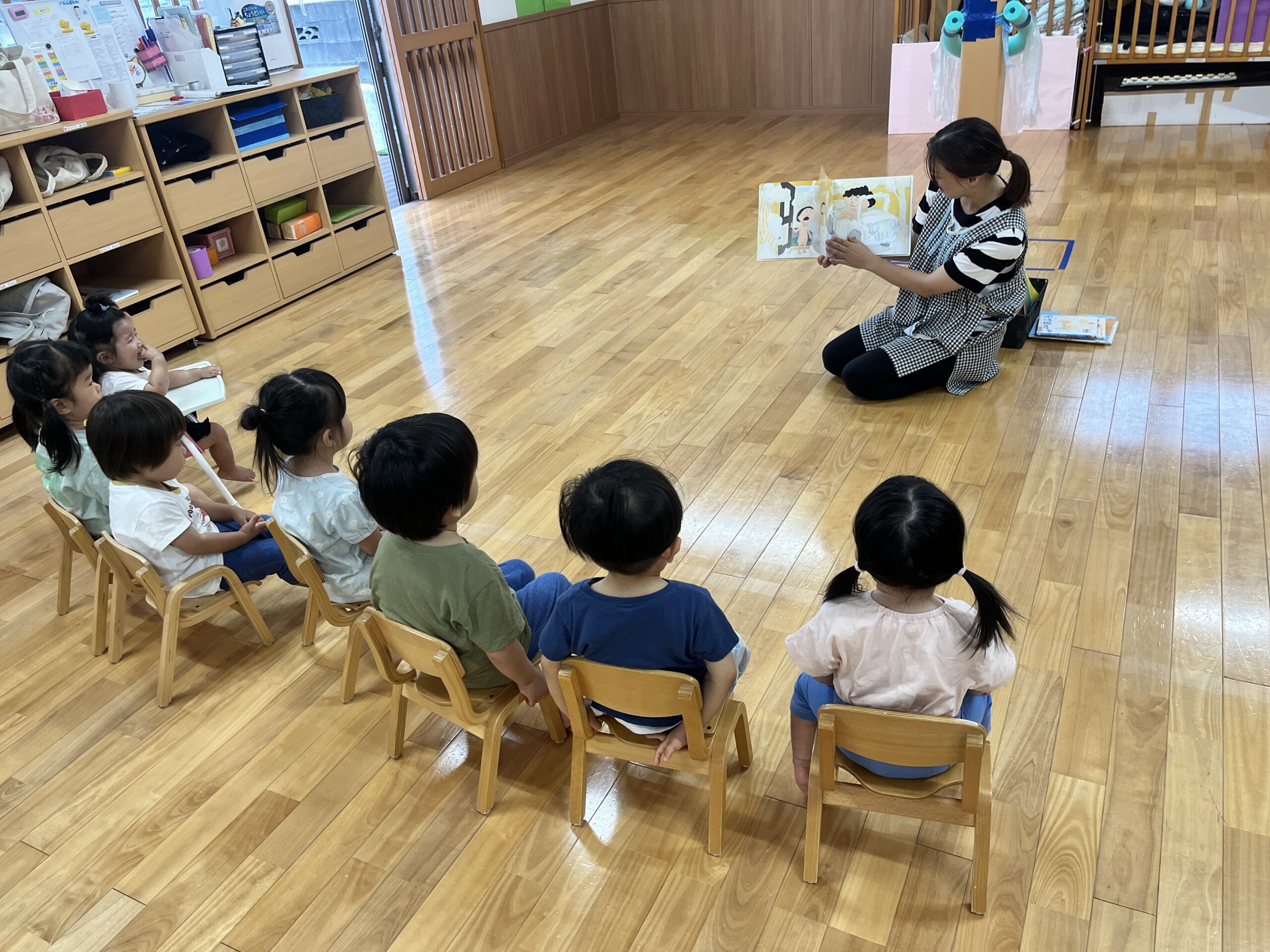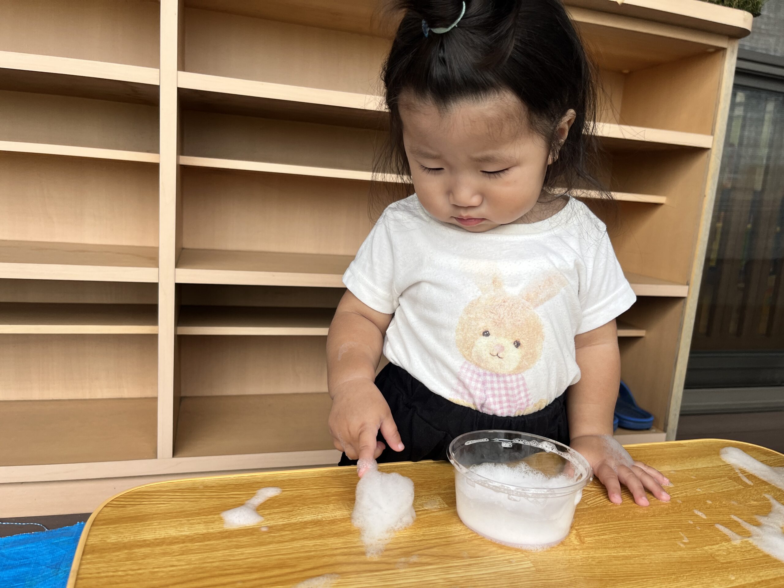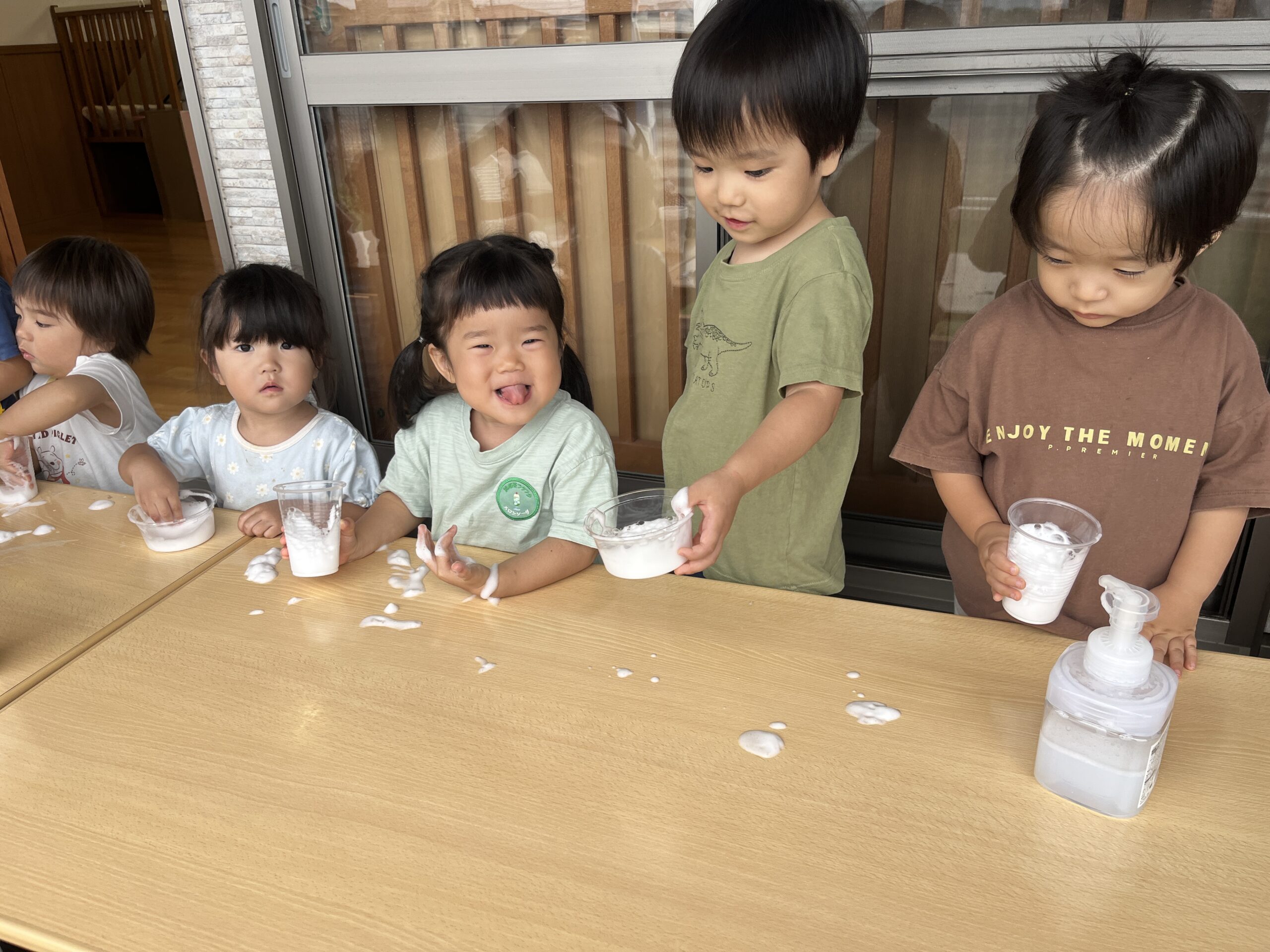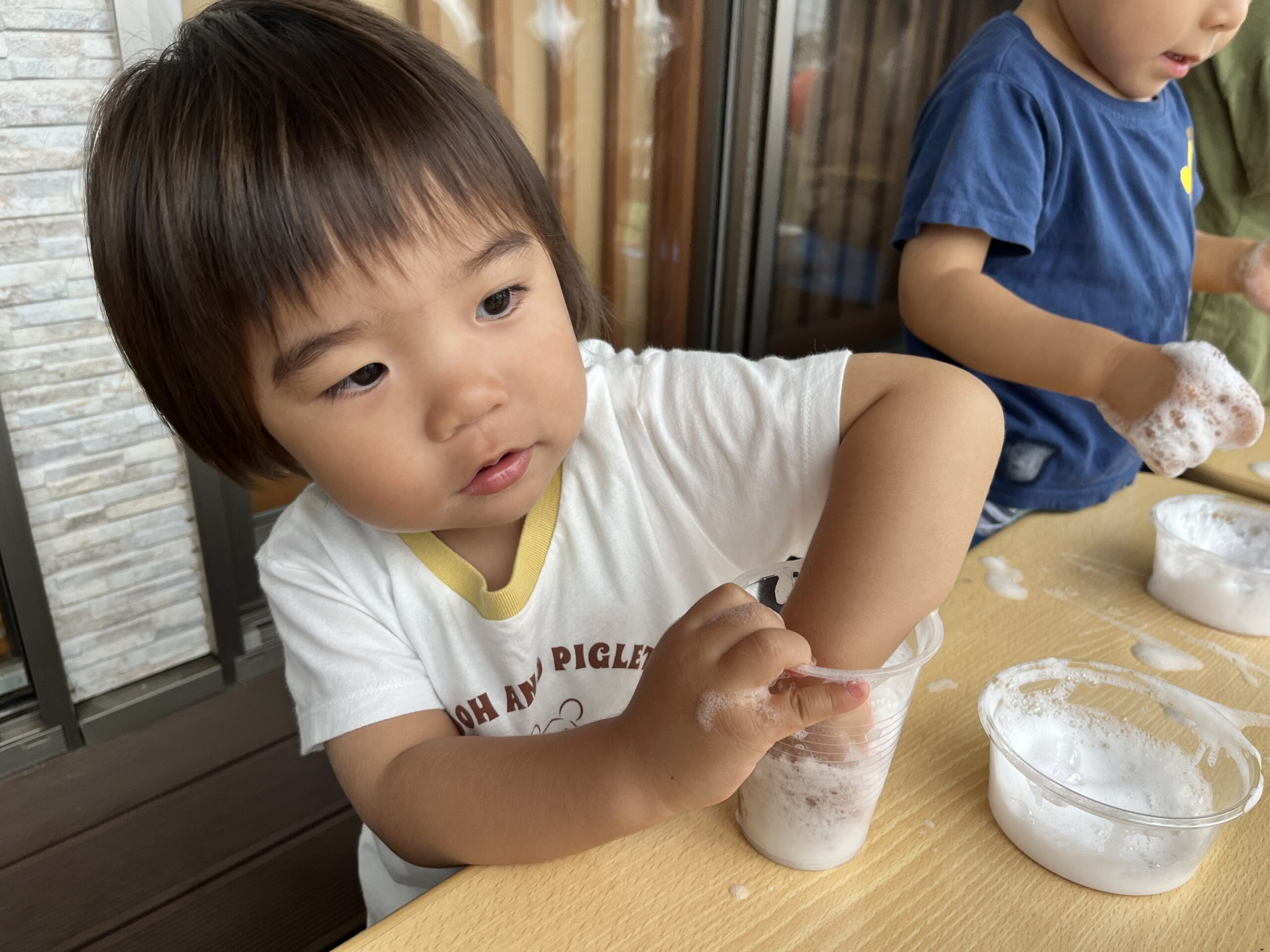 泡を使ってアイスや綿あめに見立てたりと感触遊びを楽しみました☺