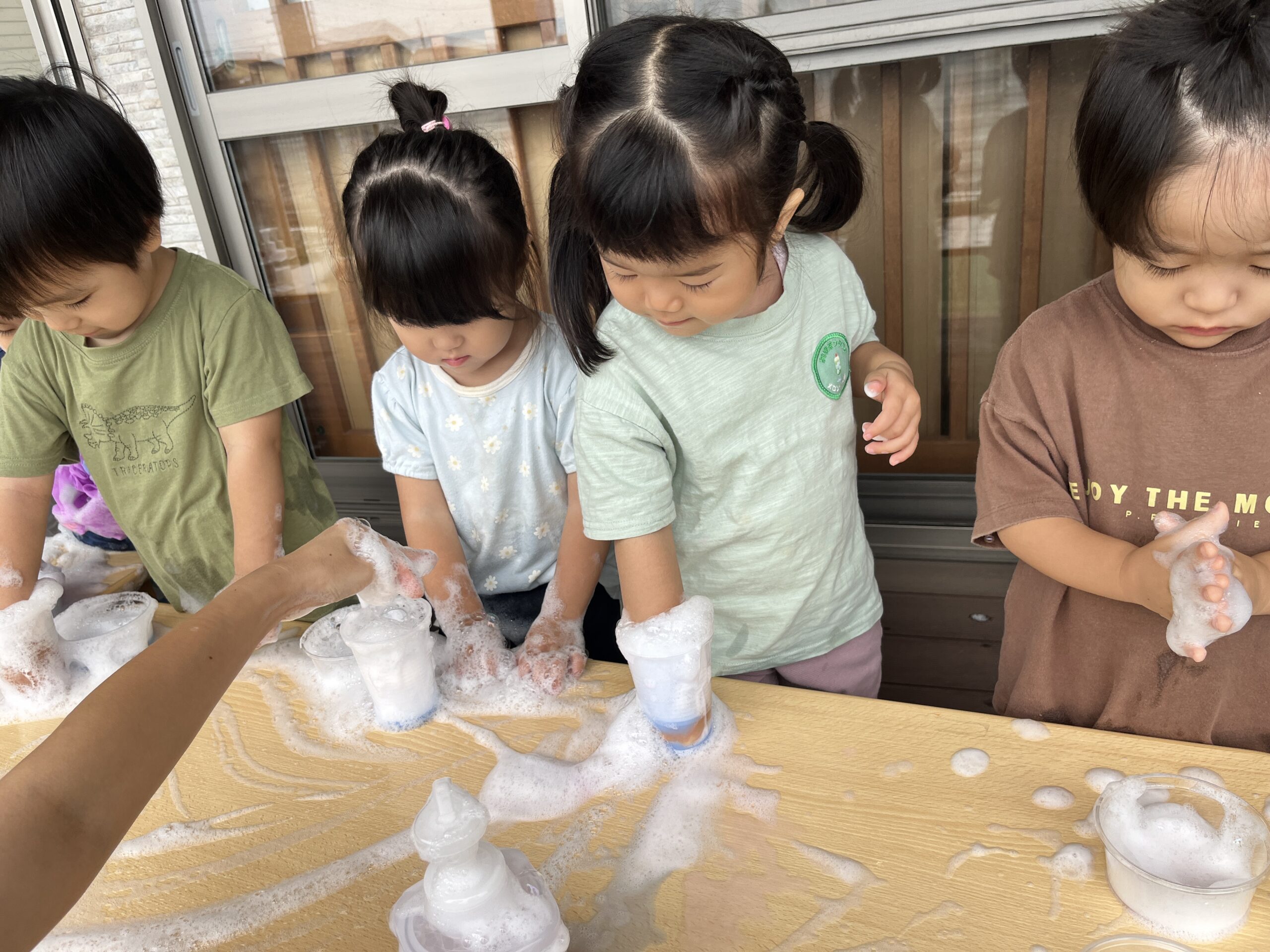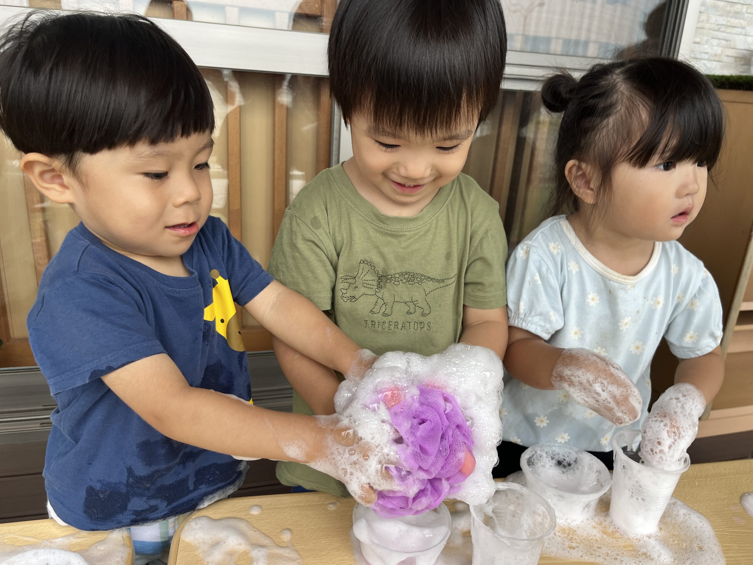 泡のふわふわ・ぬるぬるした感触を手で感じたり、