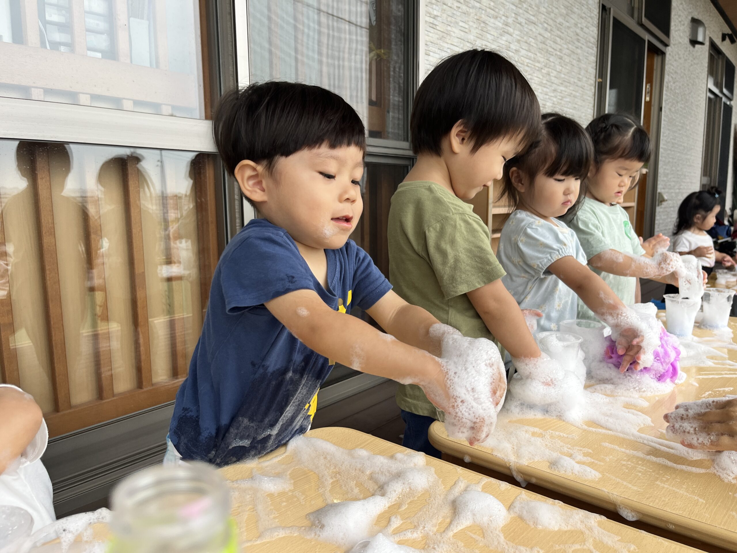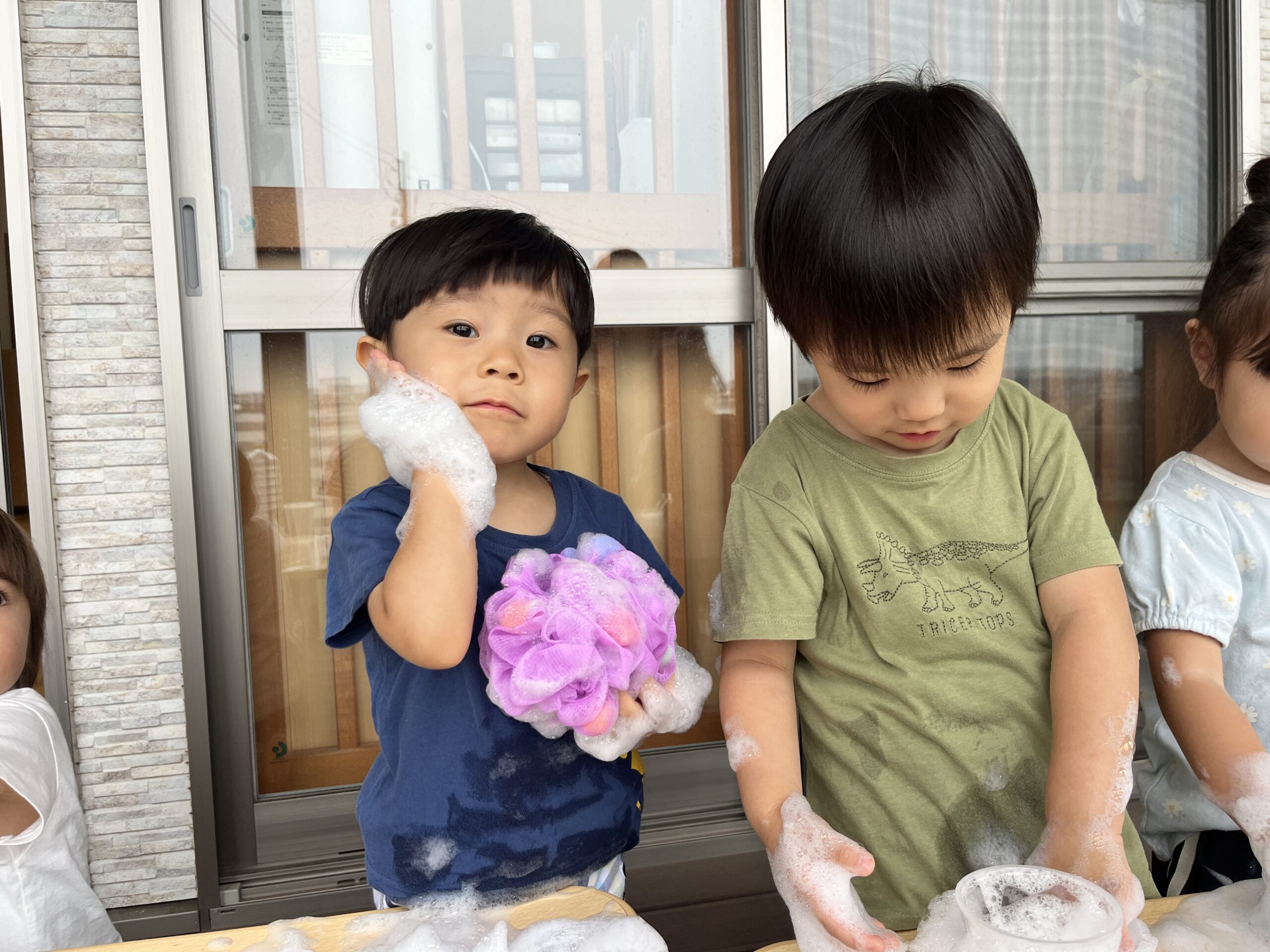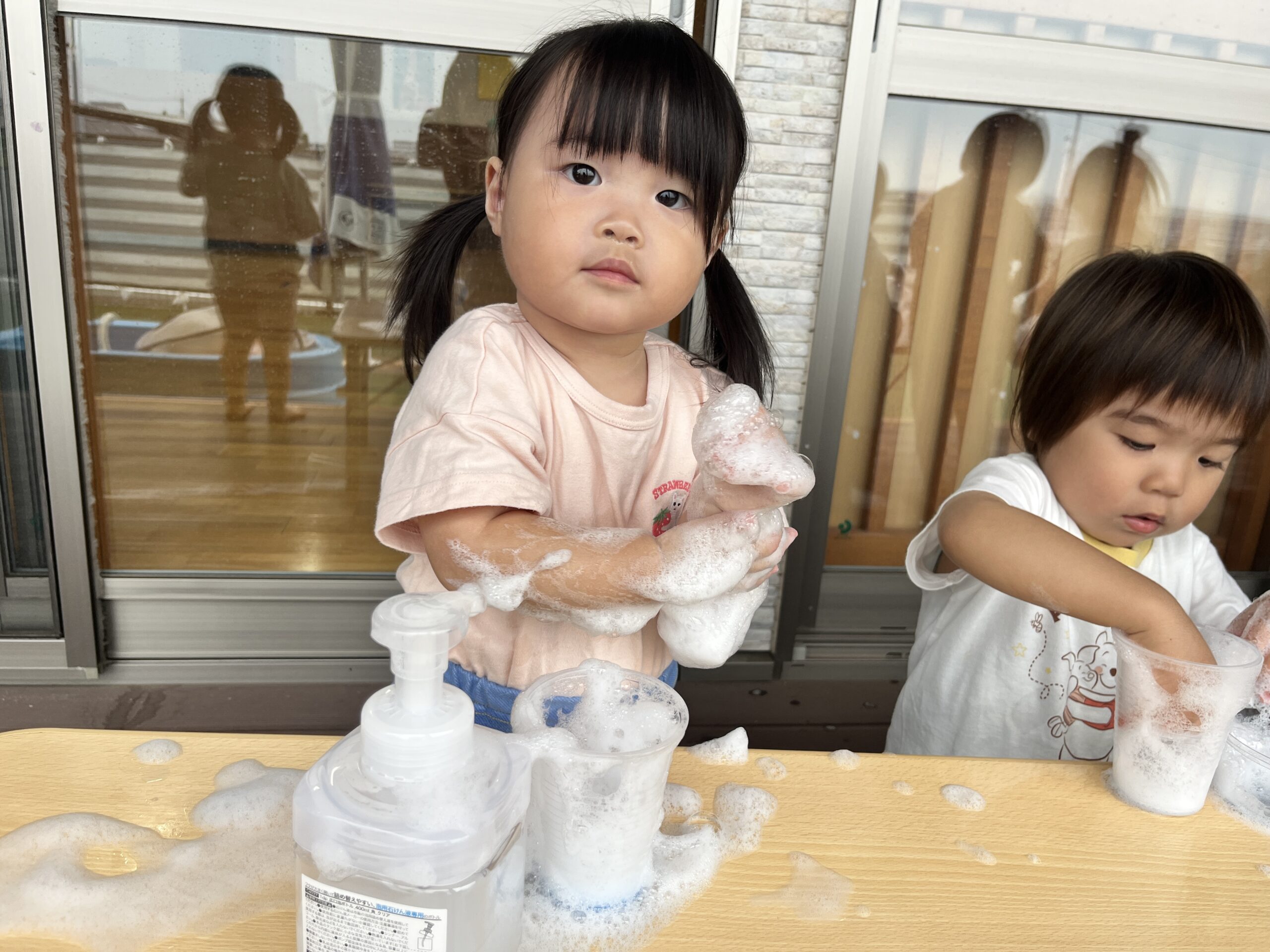 手で泡をすくったり、なでたりして感触を楽しんでいますね‼