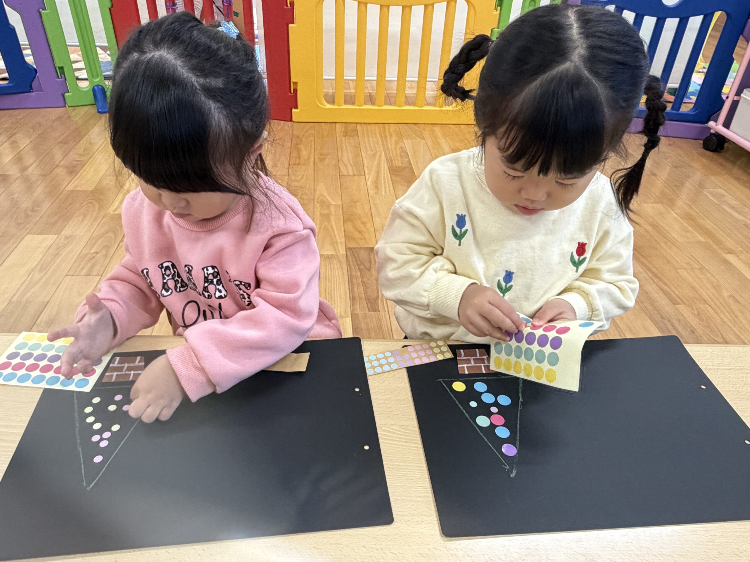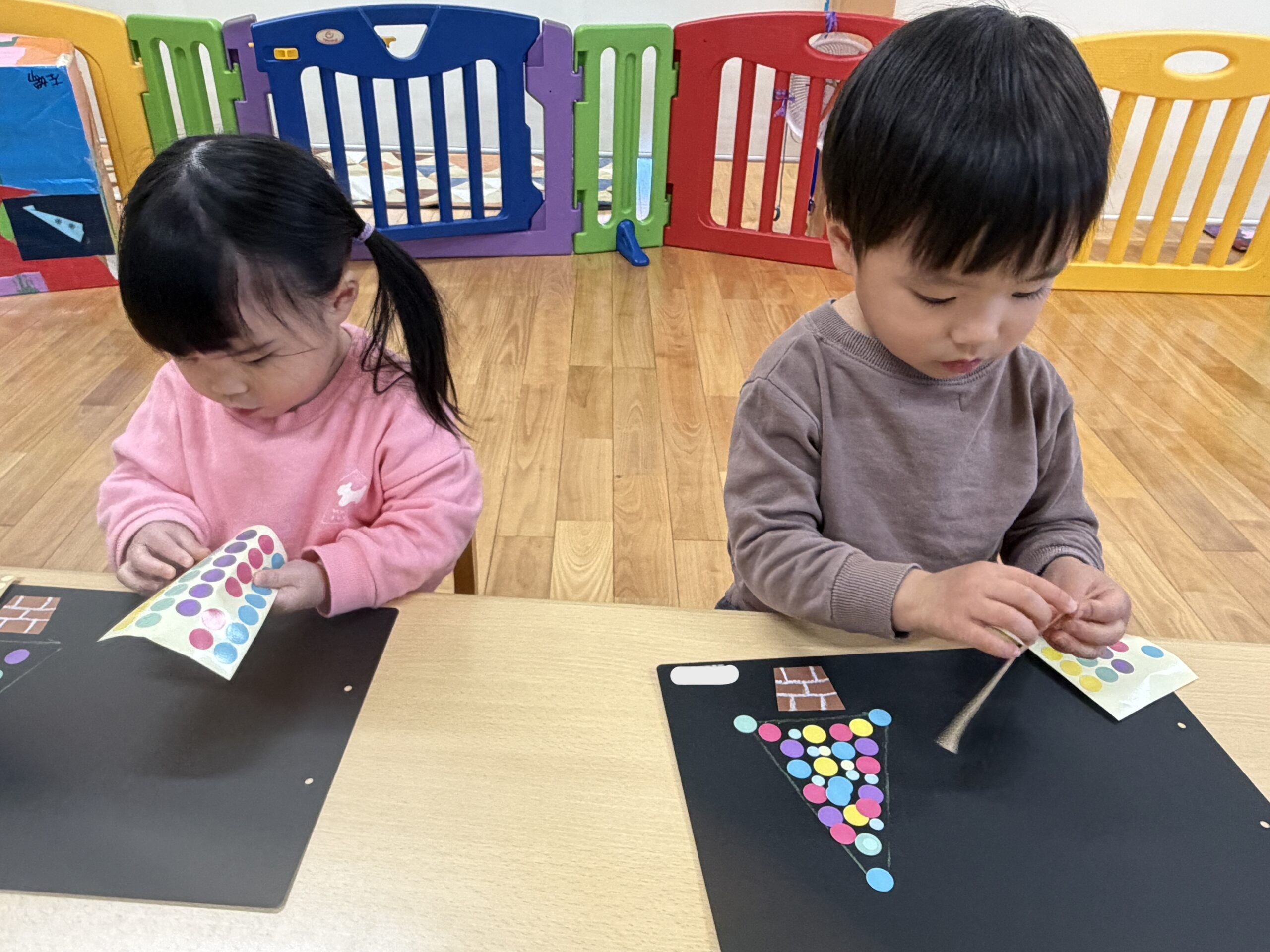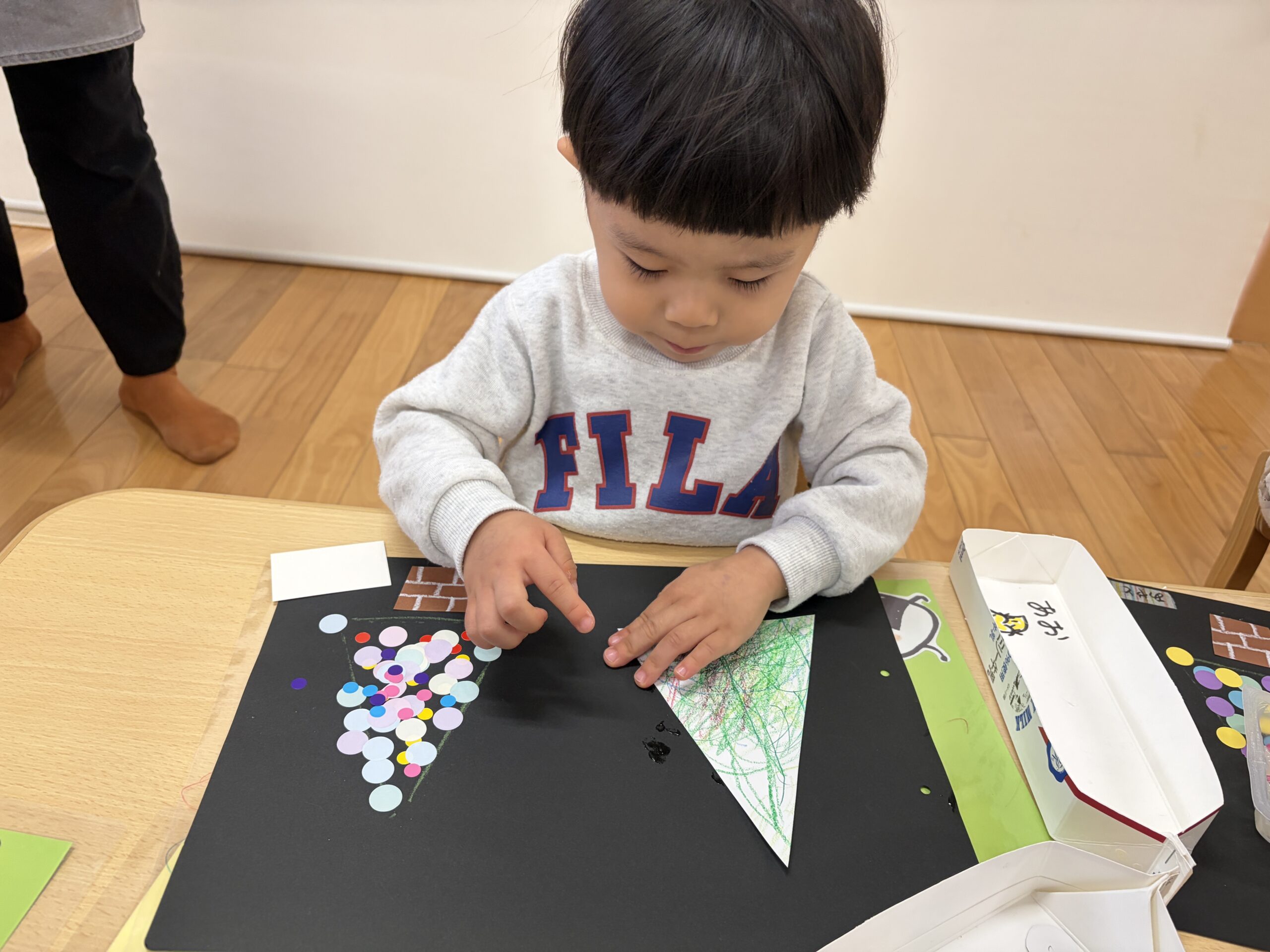 大小たくさんのシールを使って、三角の形に整えていきます(*^^*)
