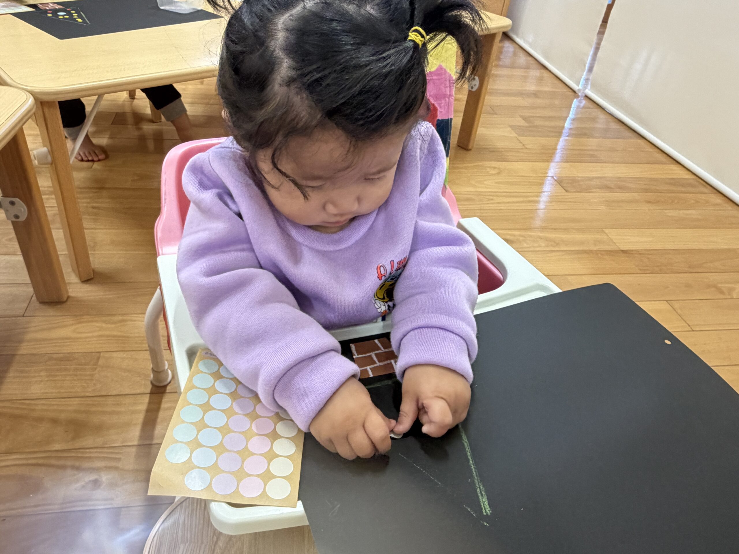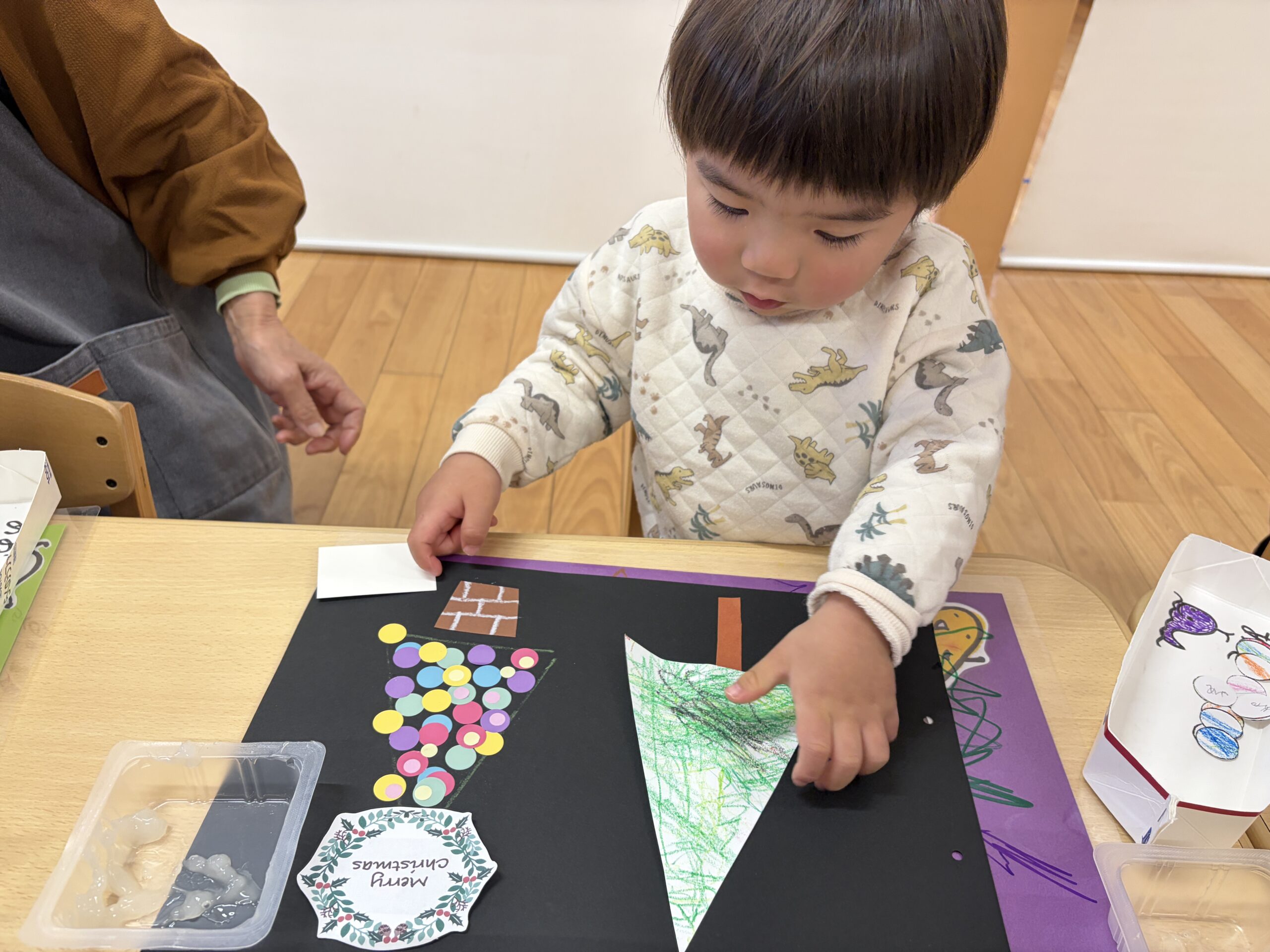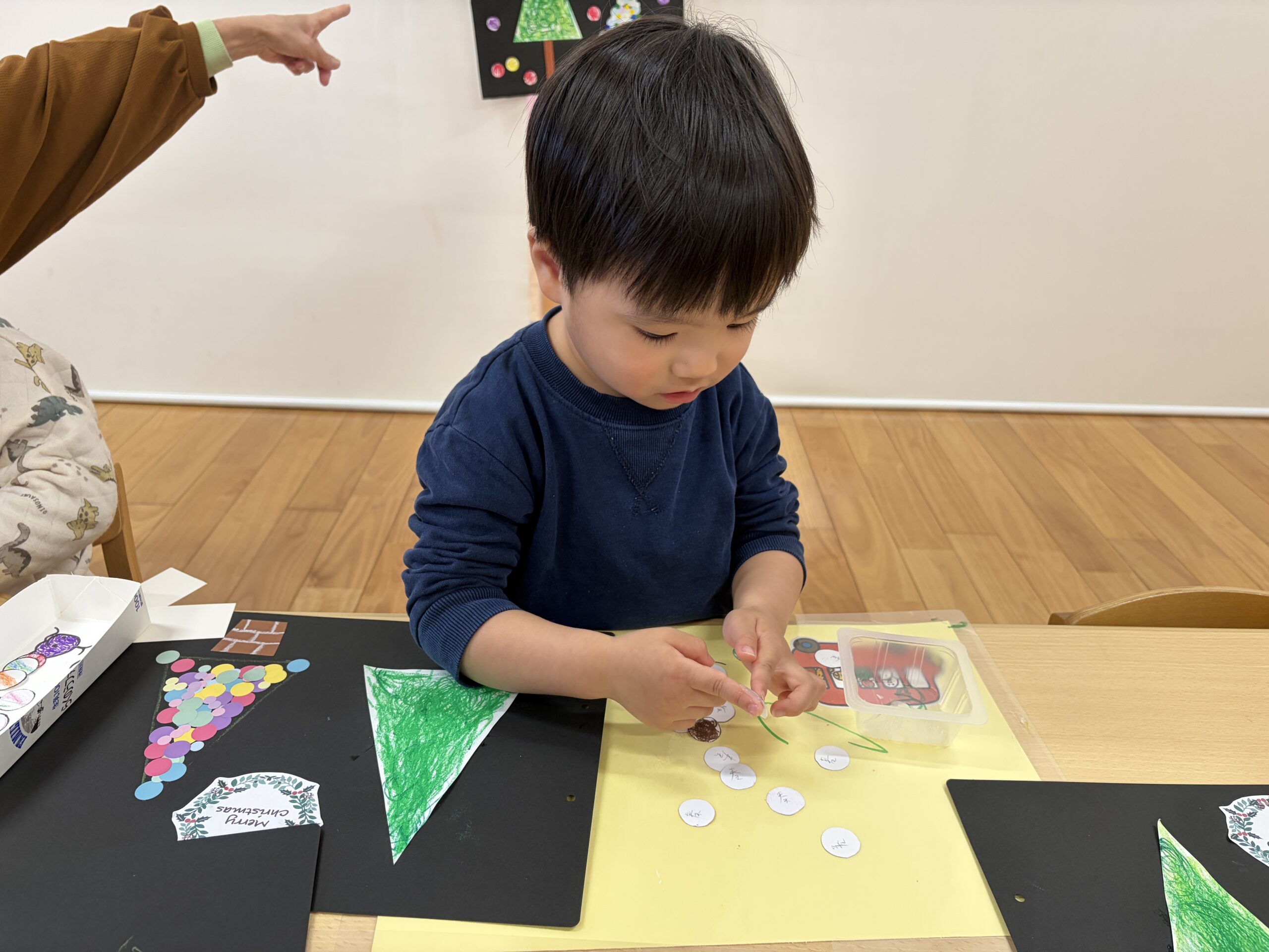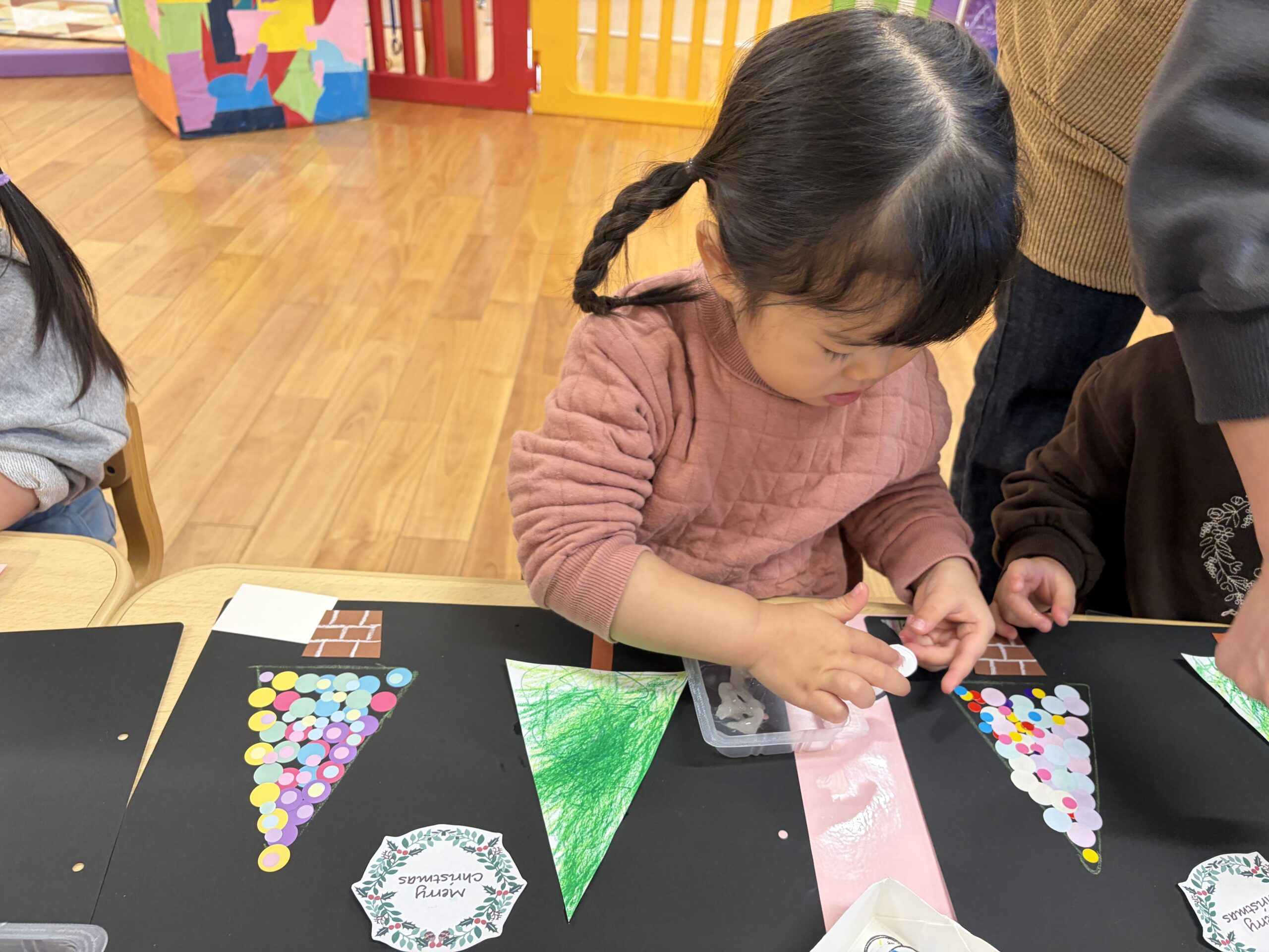 大小たくさんのシールを使って、三角の形に整えていきます(*^^*)