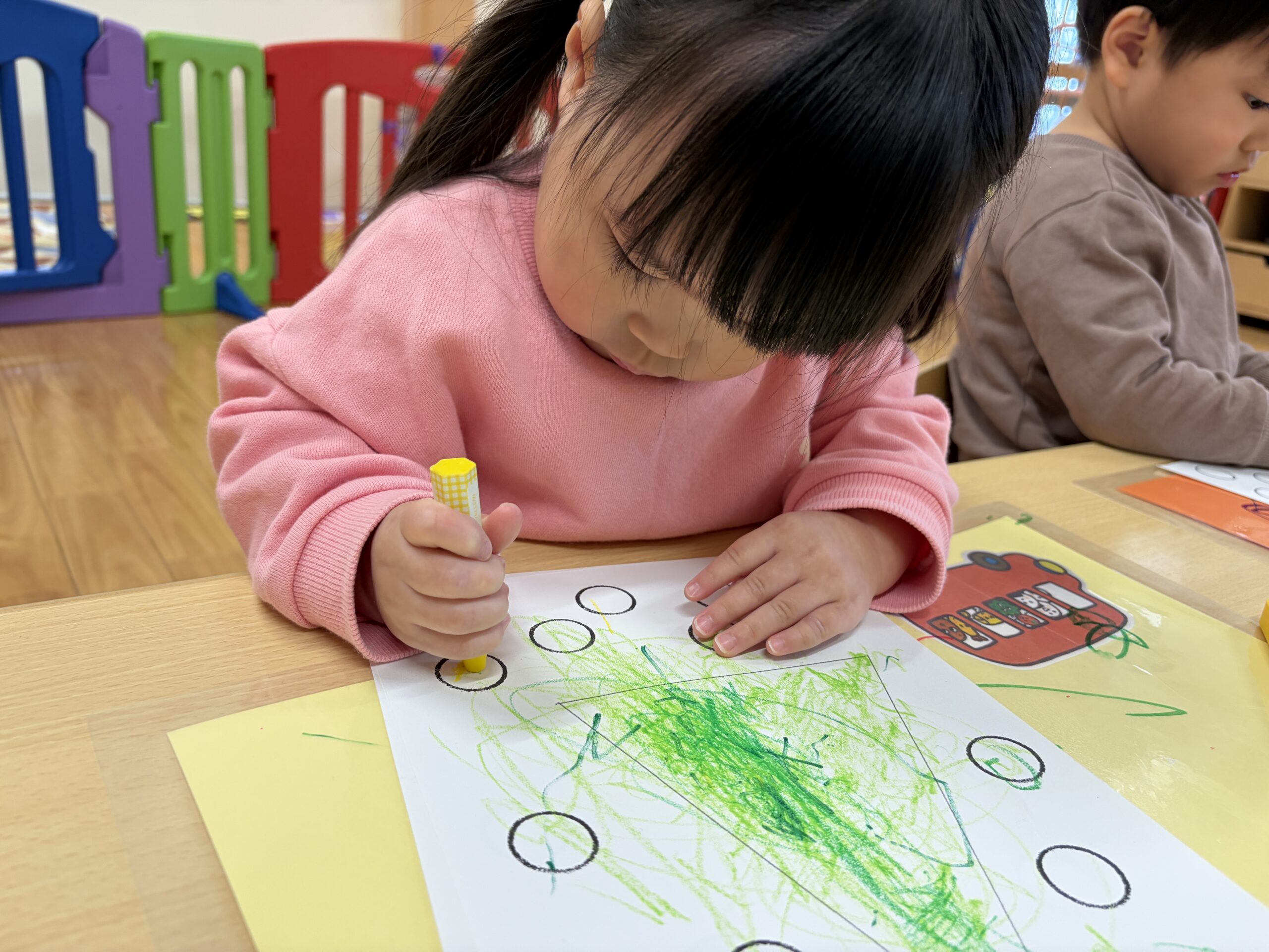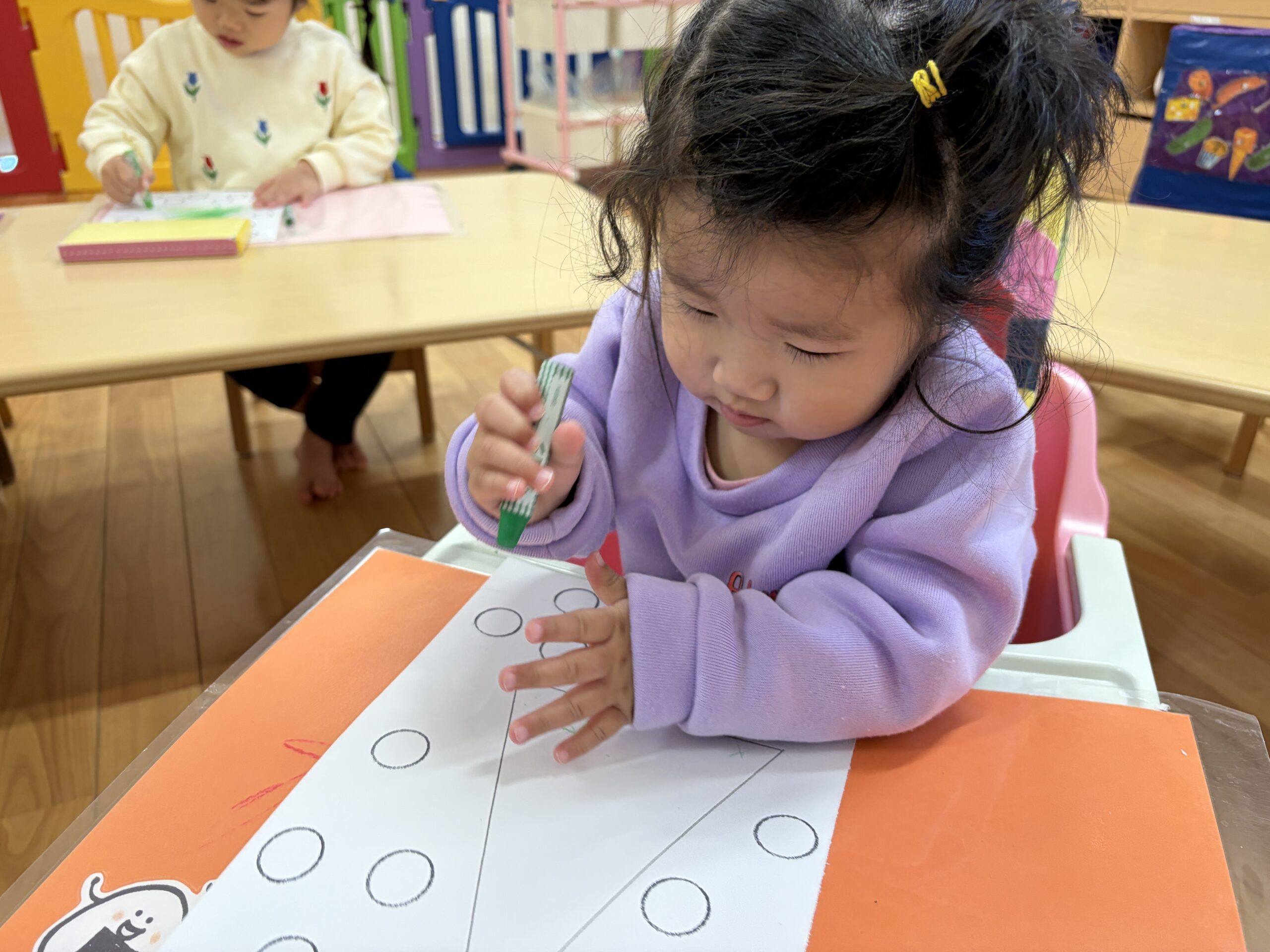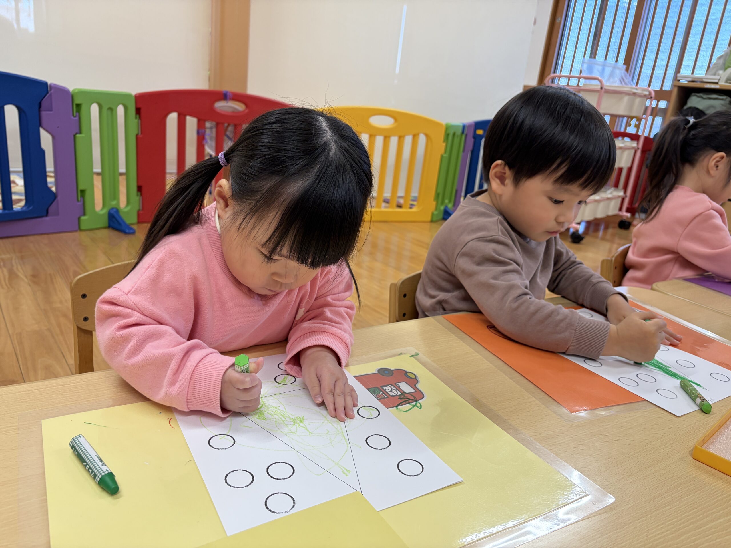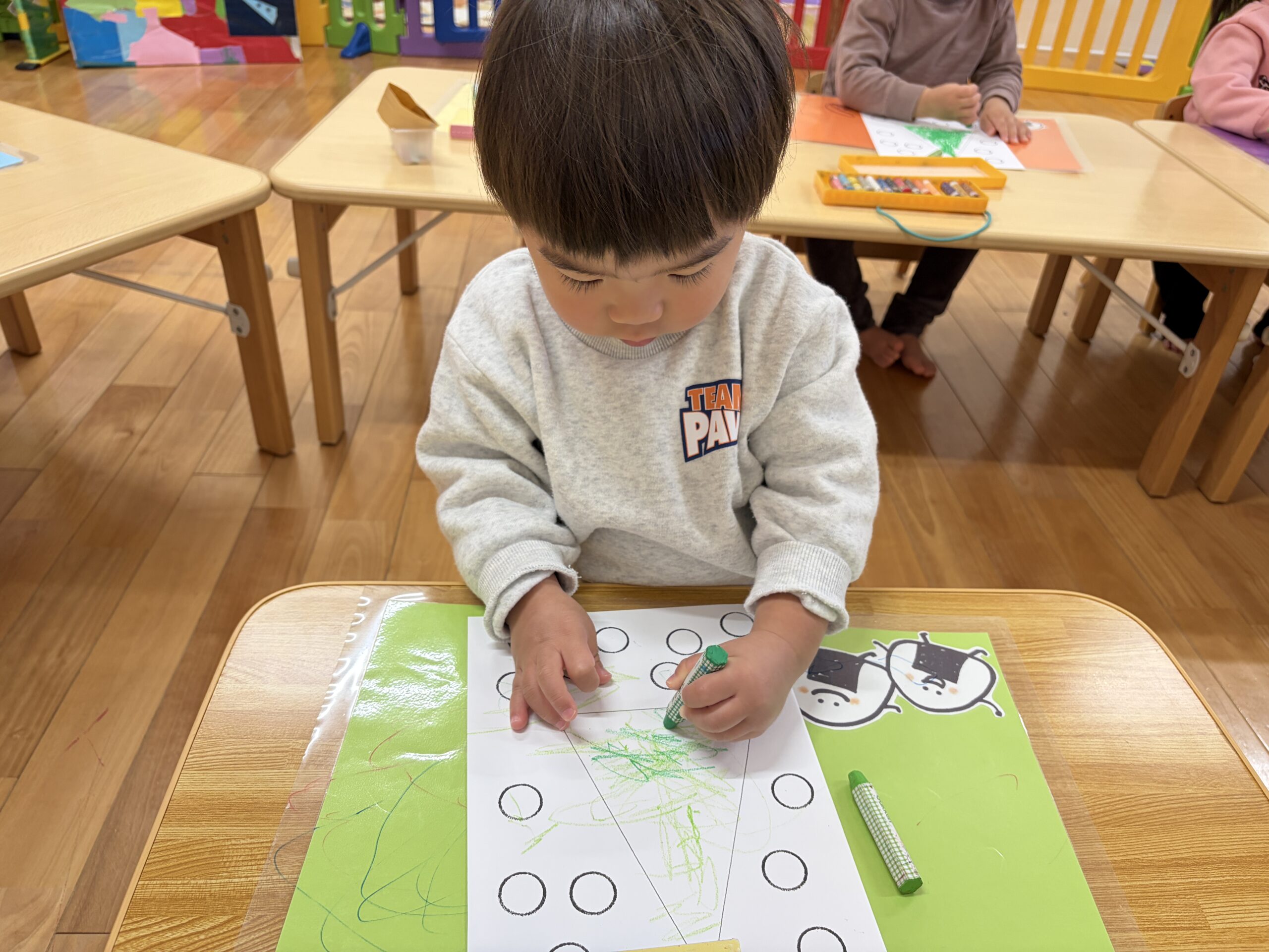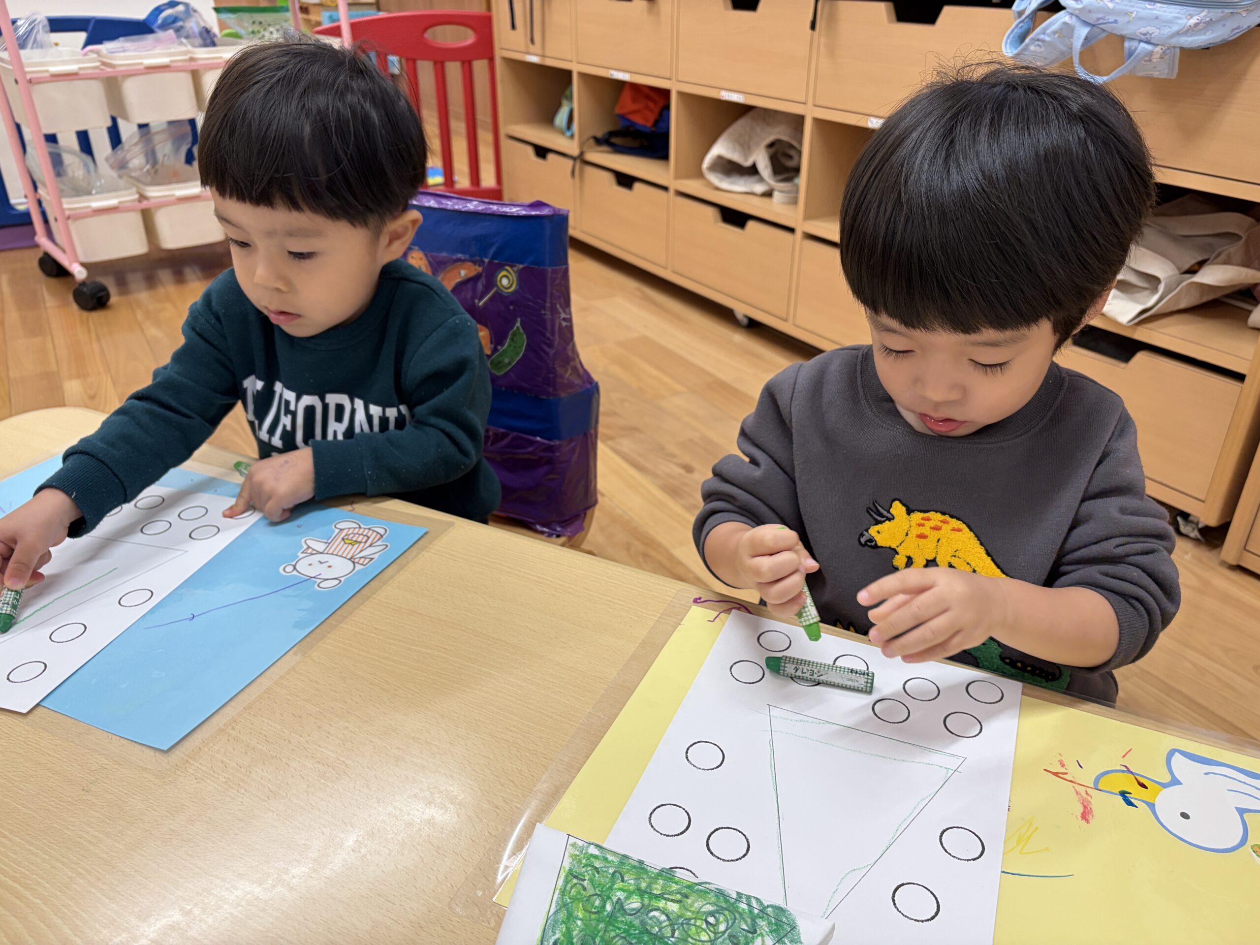 次は緑色と黄緑色のクレヨンを使ってぬりましょう。