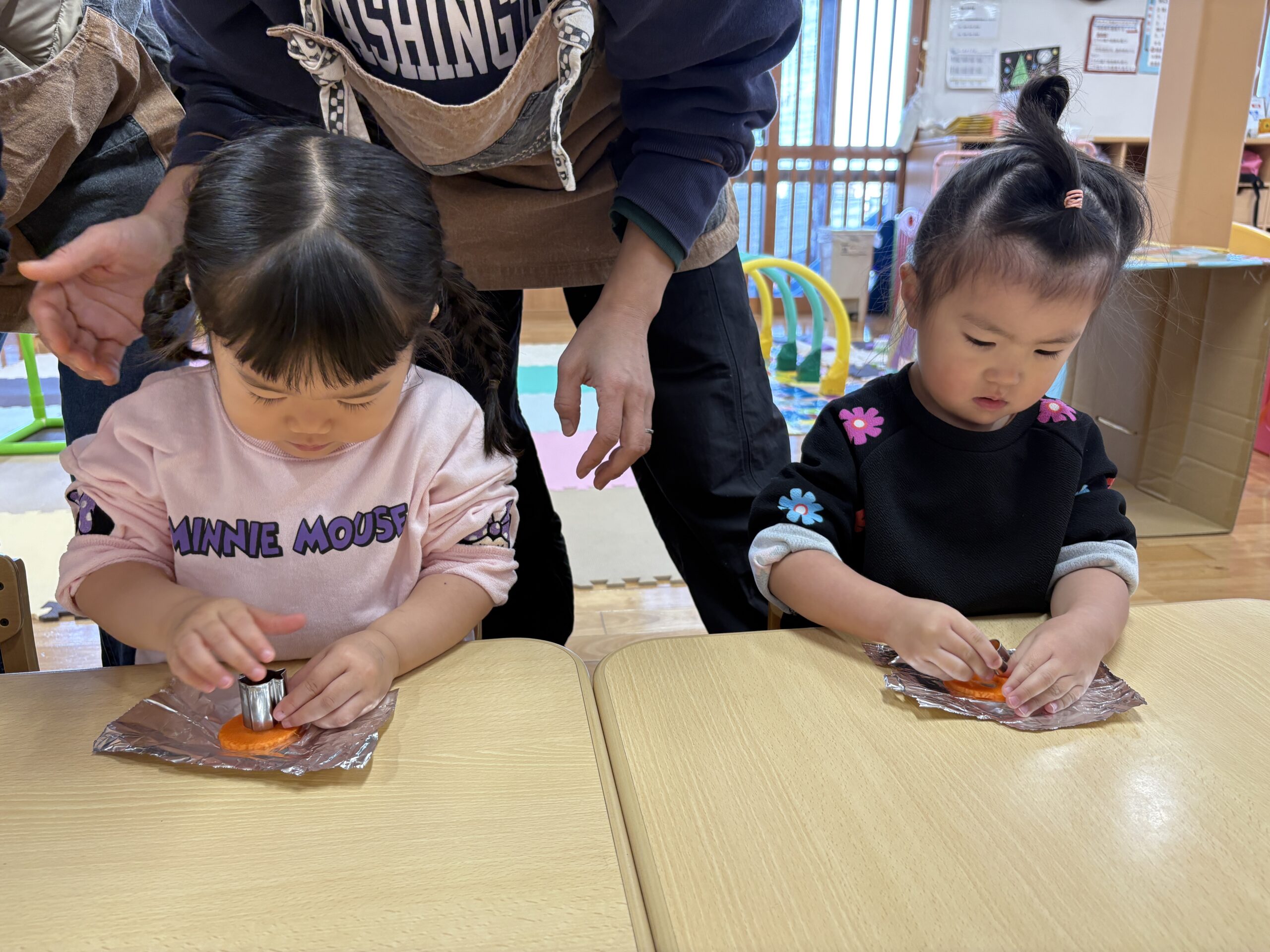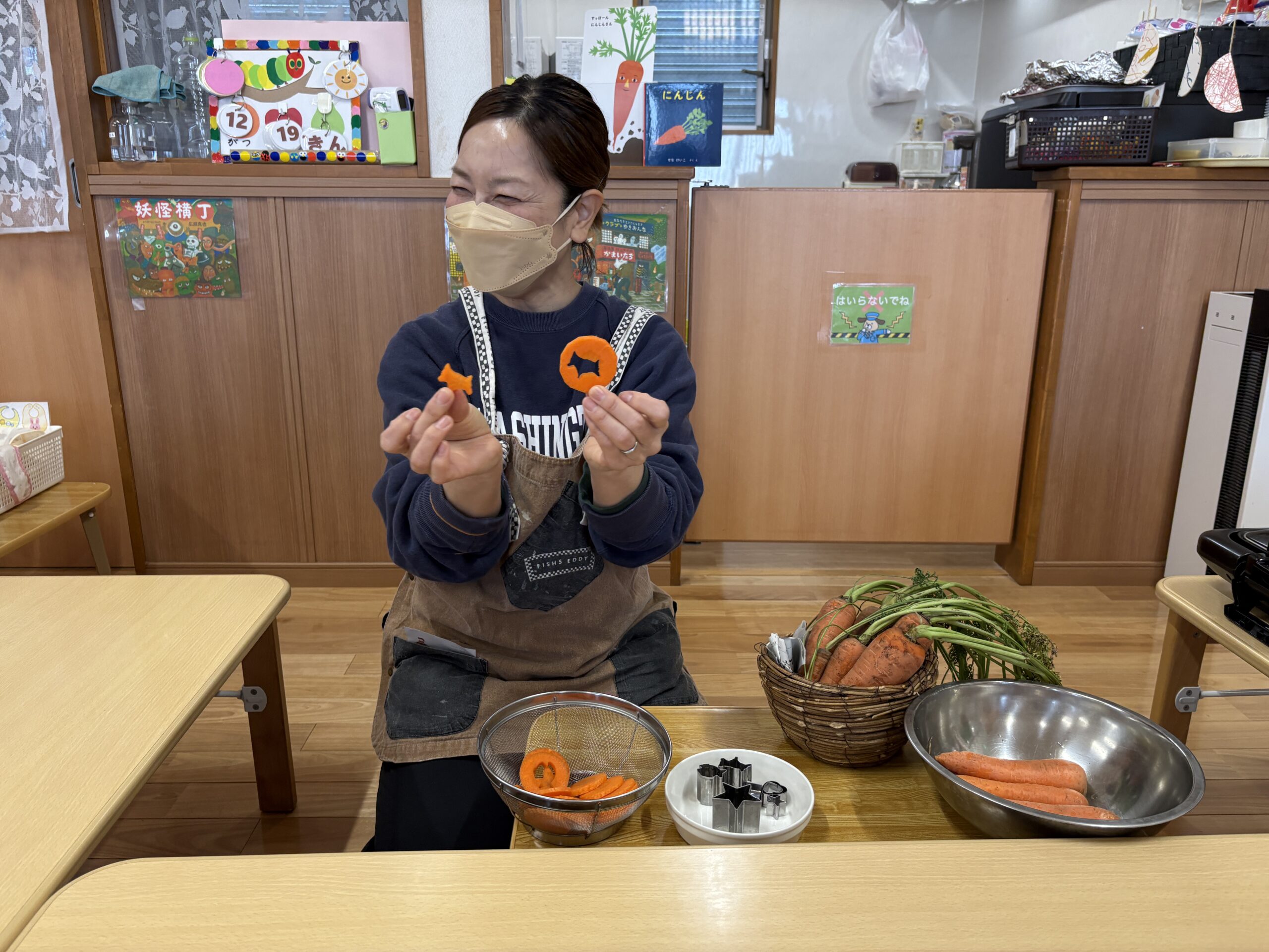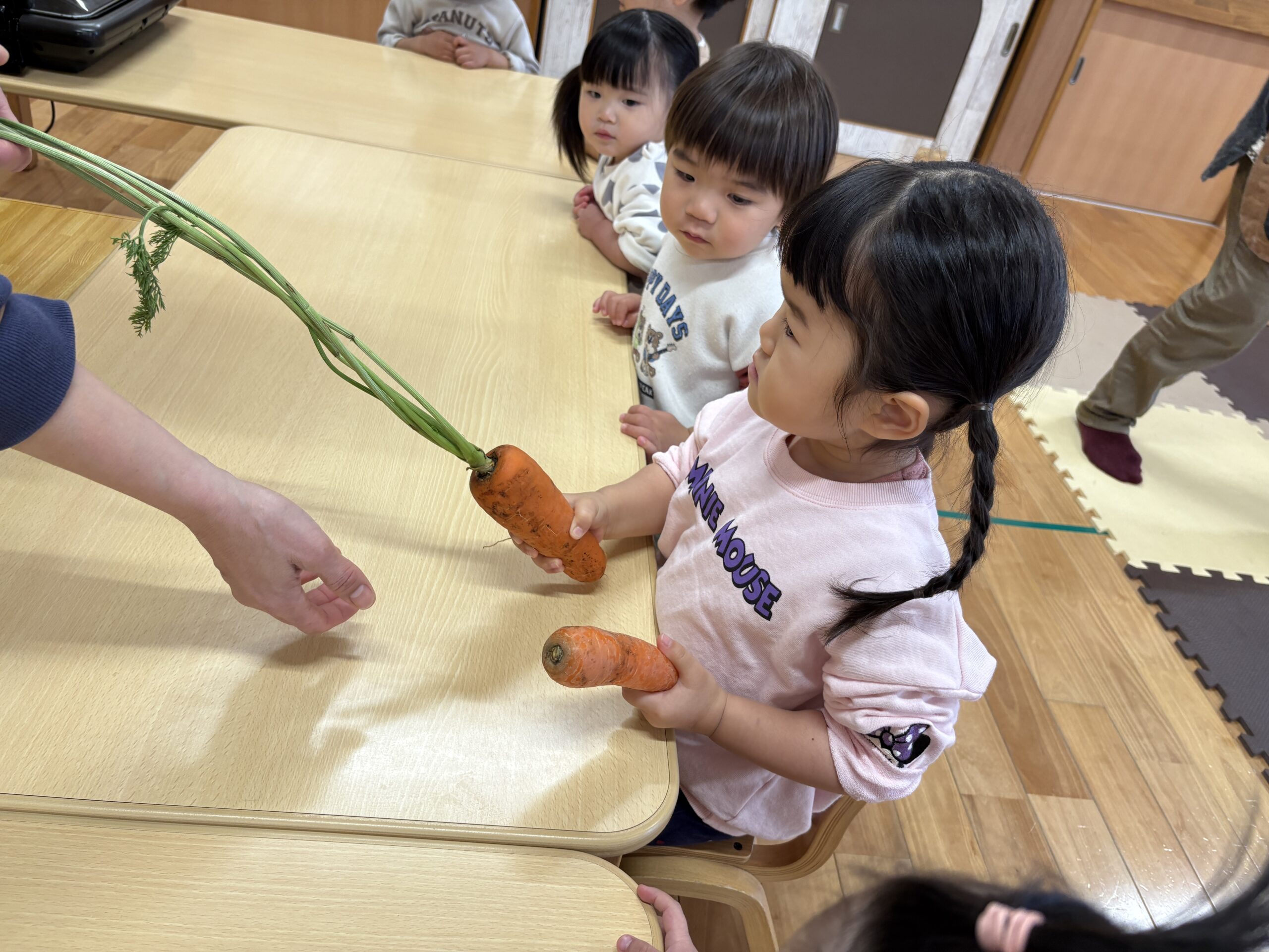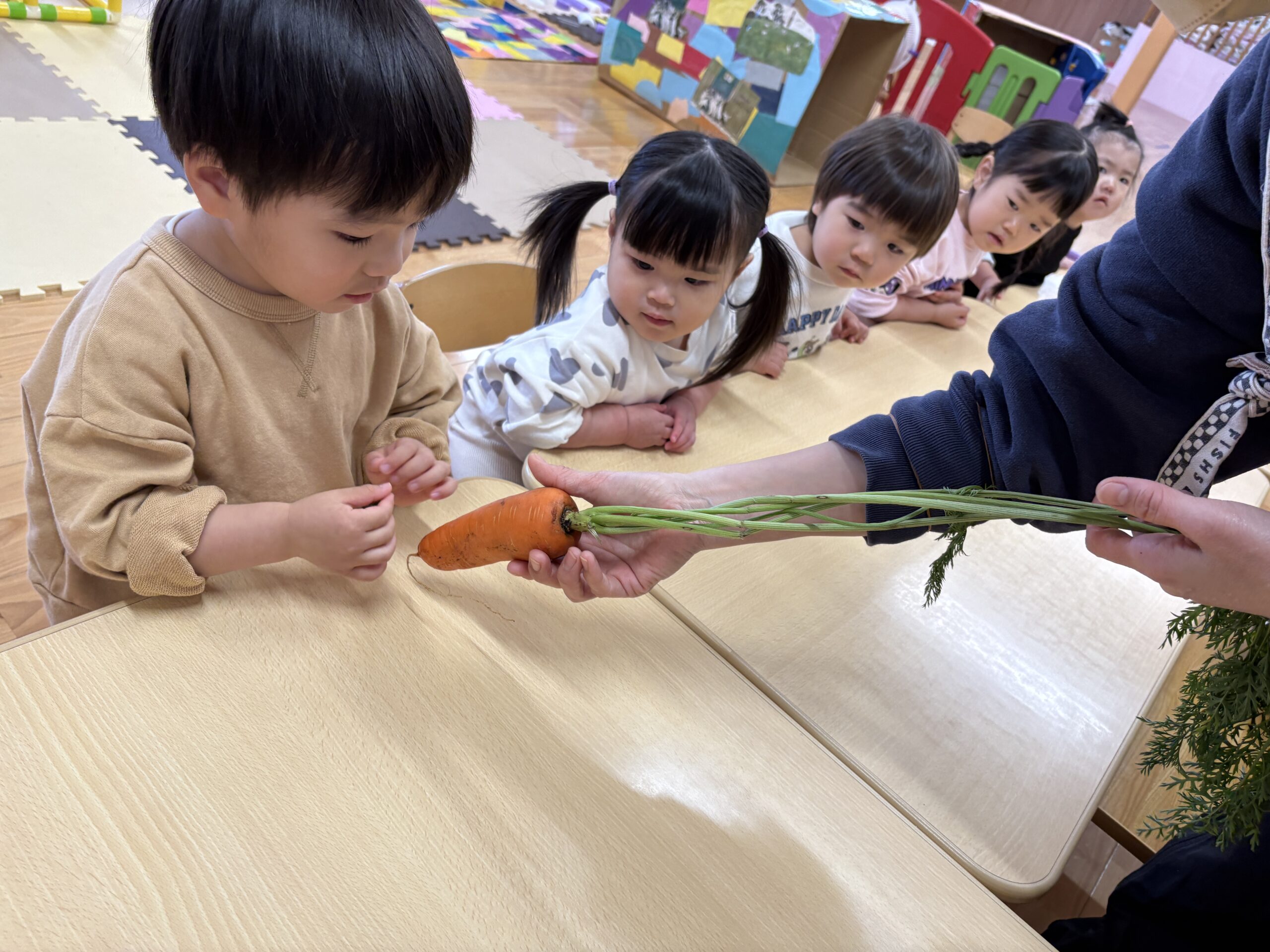 先日、子ども達が収穫してくれた人参を使って🥕食育活動を行いました。