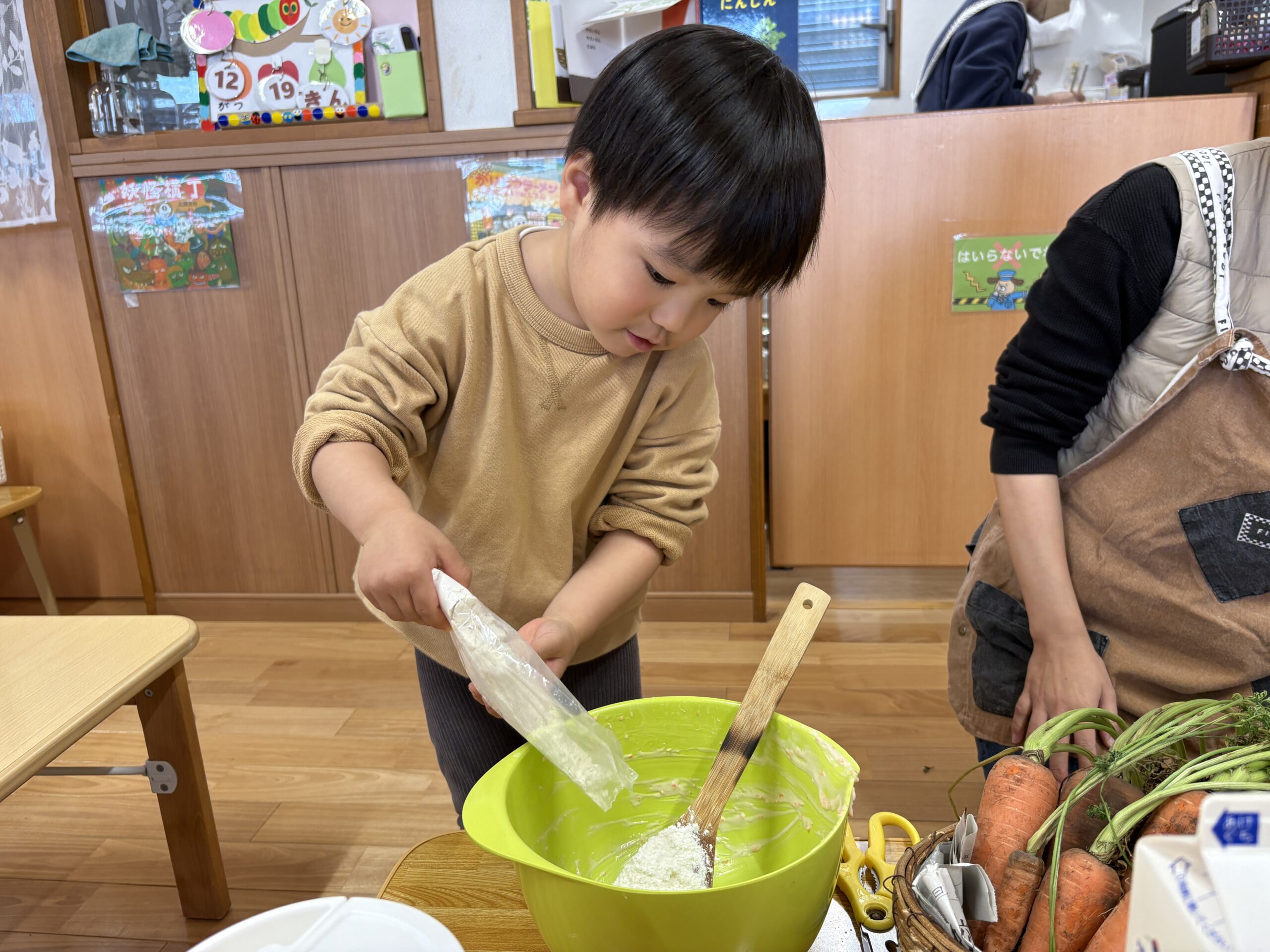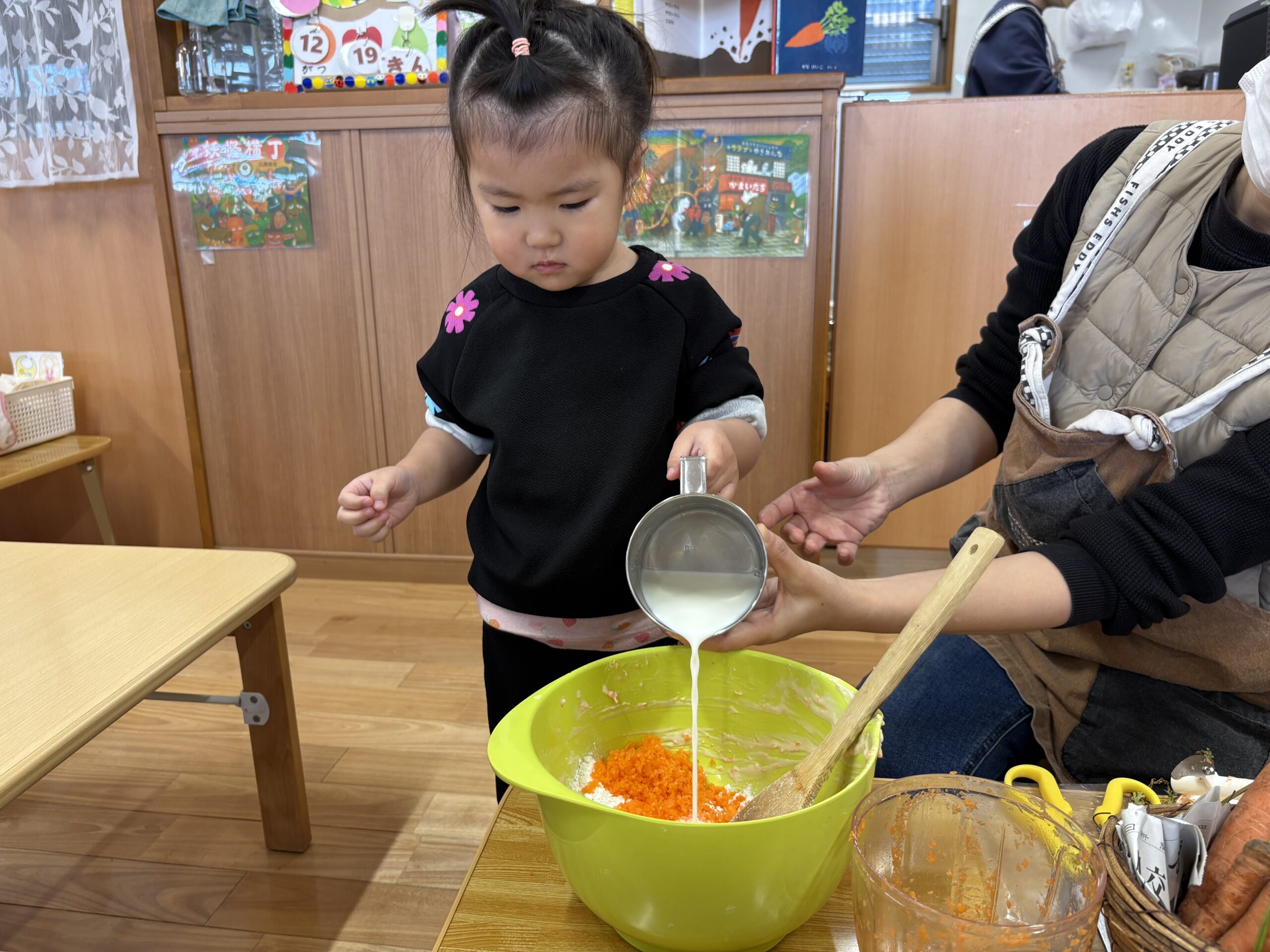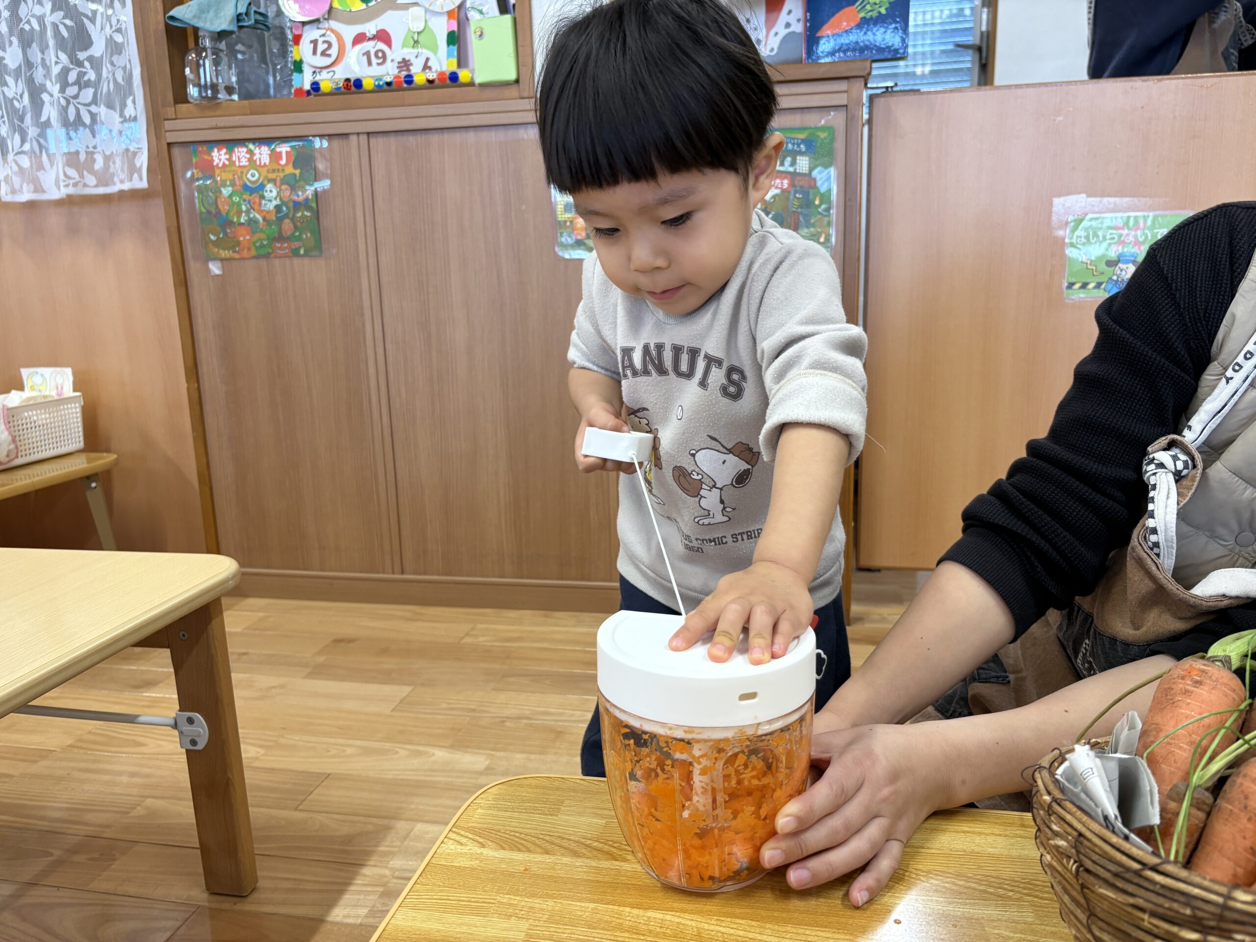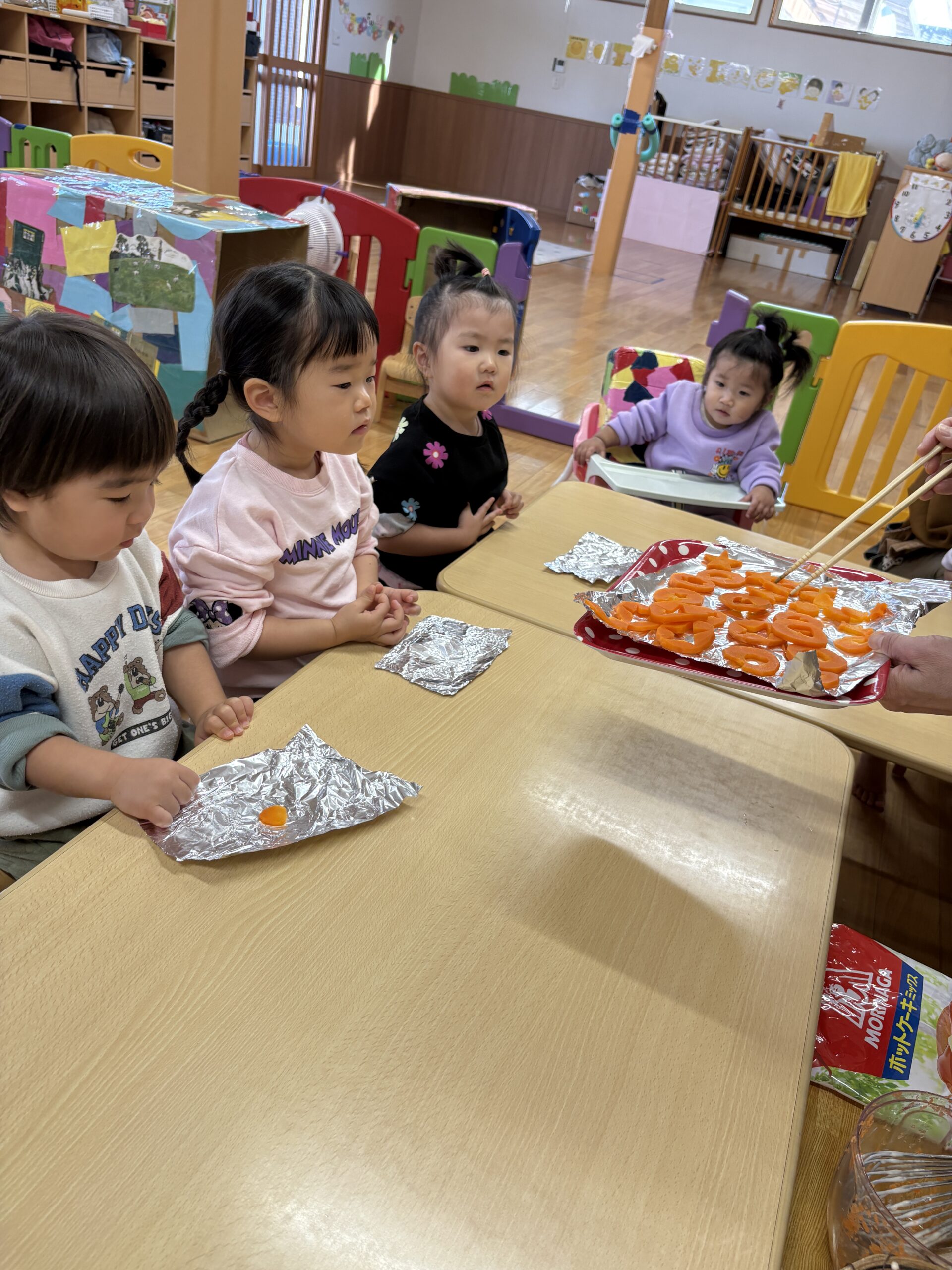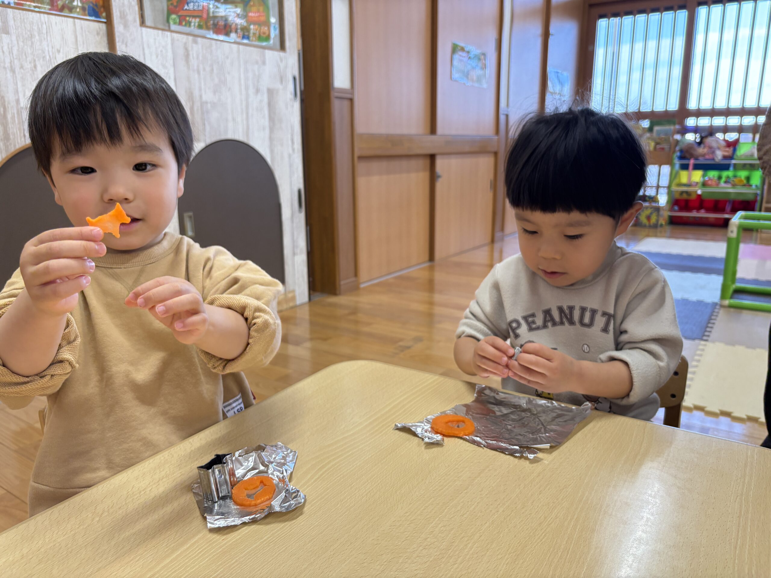 先日、子ども達が収穫してくれた人参を使って🥕食育活動を行いました。
