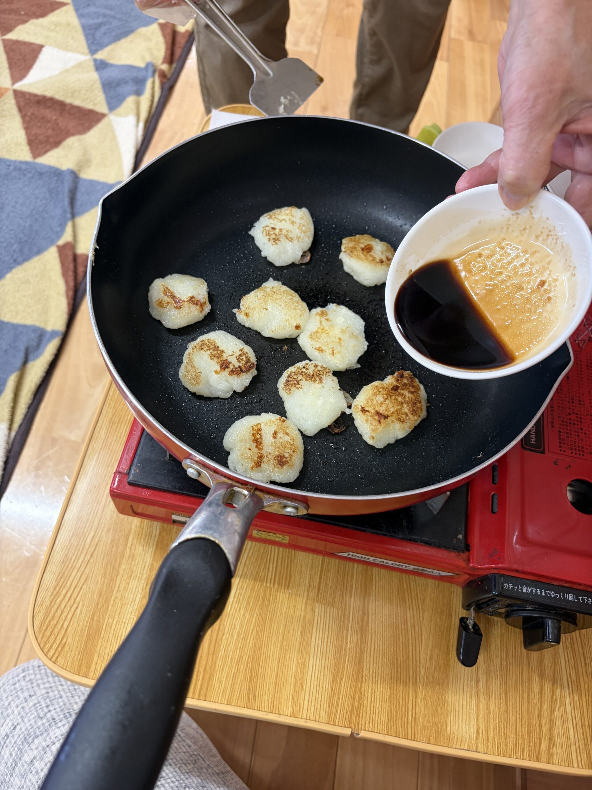 焼き目がついたら、醬油砂糖を入れてからめます