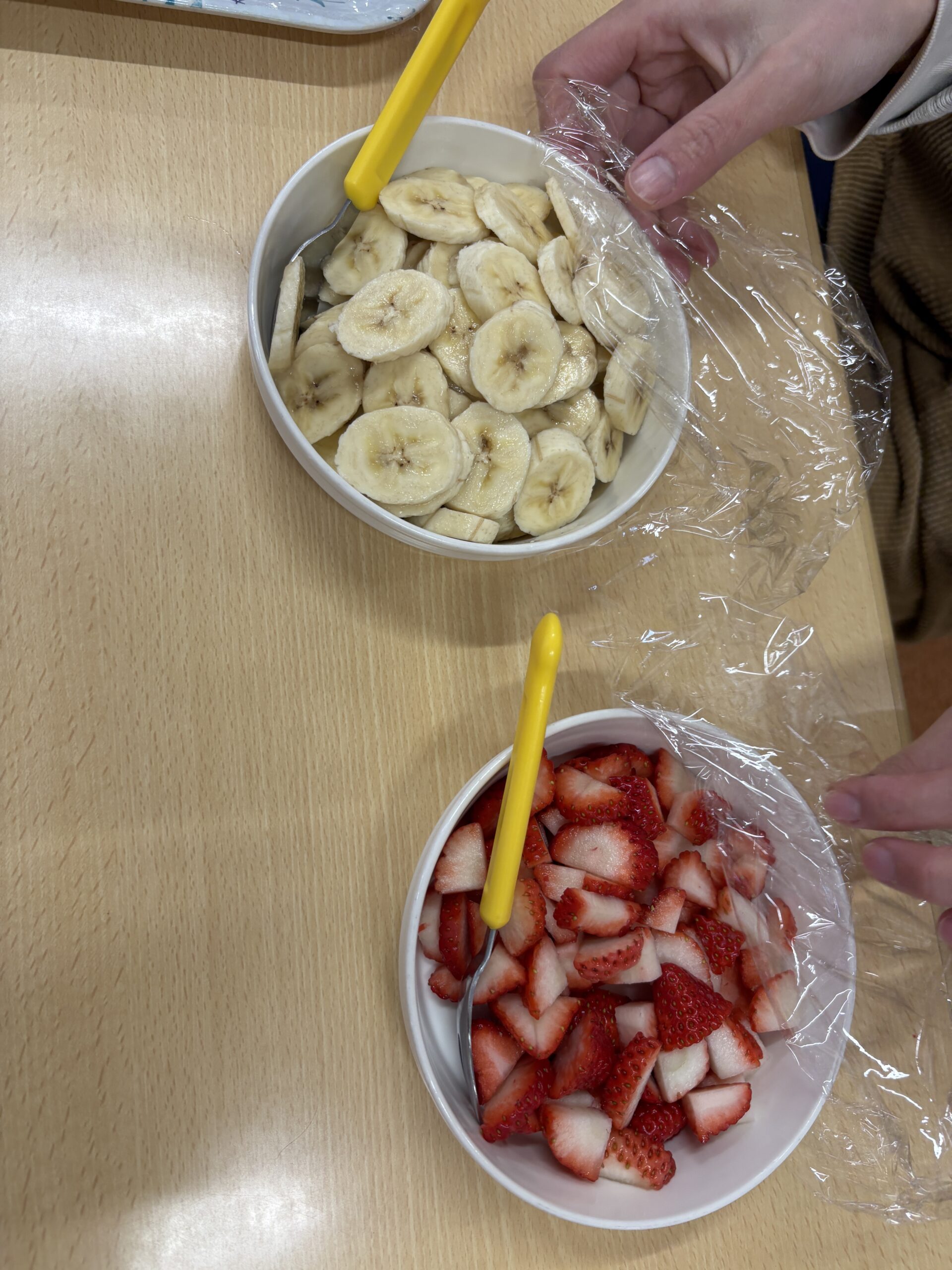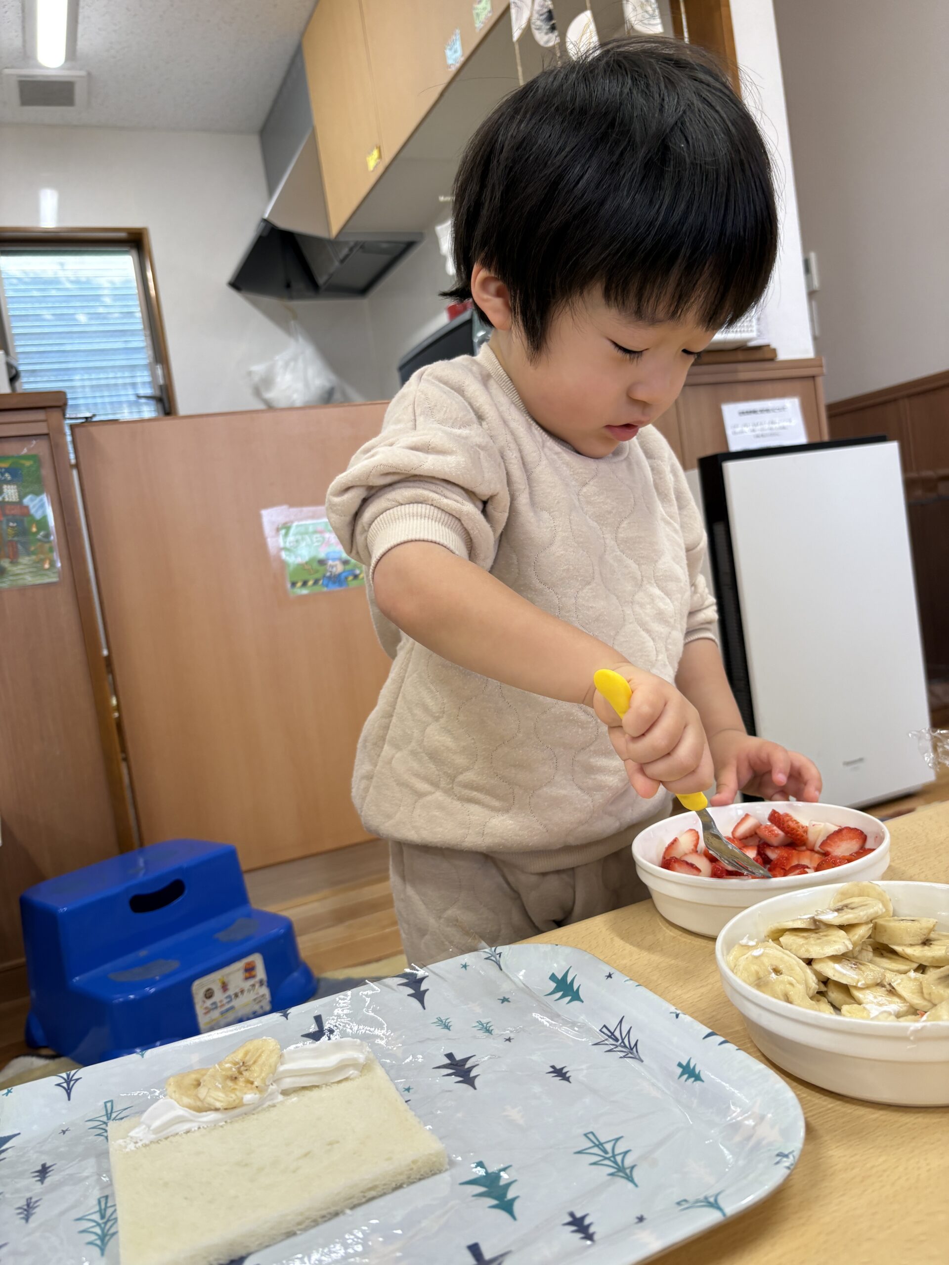 みんなが大好き生クリームとバナナとイチゴをトッピングしていきます🥄
