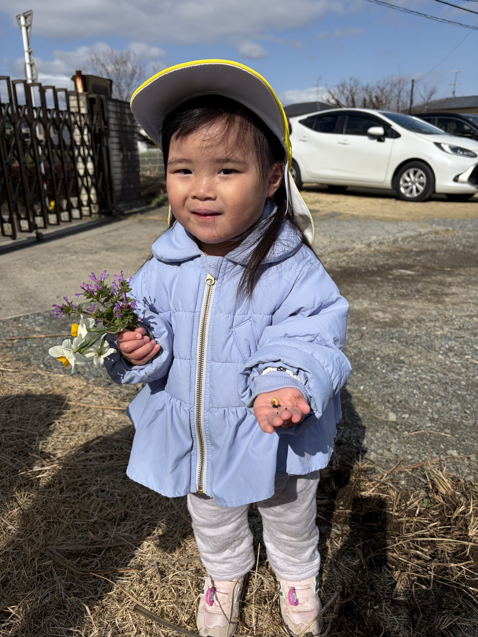 砂利の駐車場は野菜や草花、虫たちと出会えます。